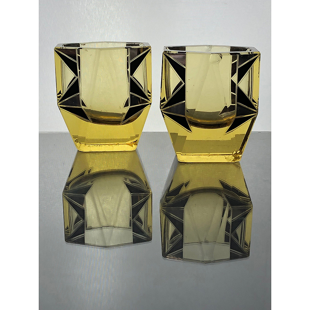 ART DECO SHOT GLASS AMBER SMOKED CUT CRYSTAL (X2)