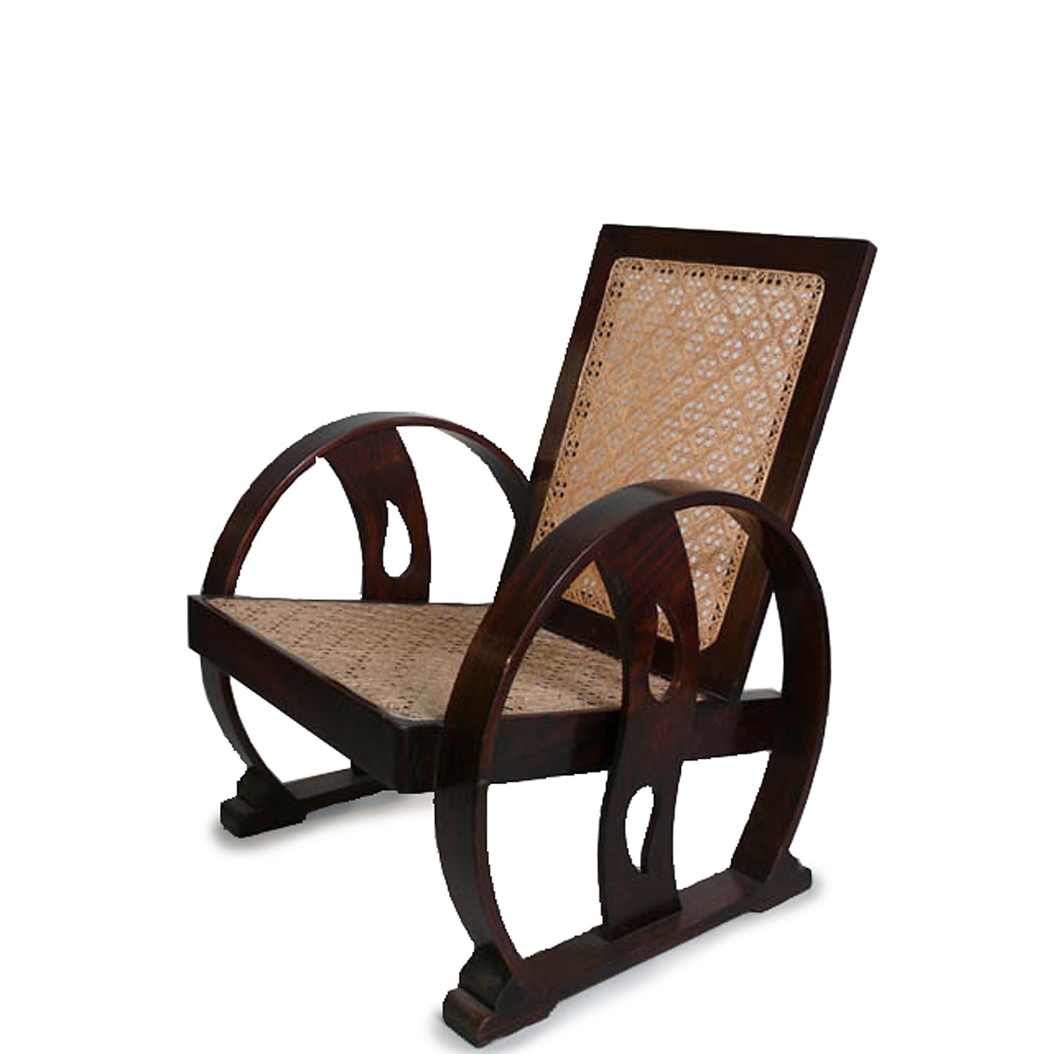 ART DECO ANGLO INDIAN ROSEWOOD ARM CHAIR WITH RATTAN SEAT AND BACK CIRCULAR SIDES CIRCA 1930 84 CM HIGH 68 CM WIDE 71 CM DEEP (X2)