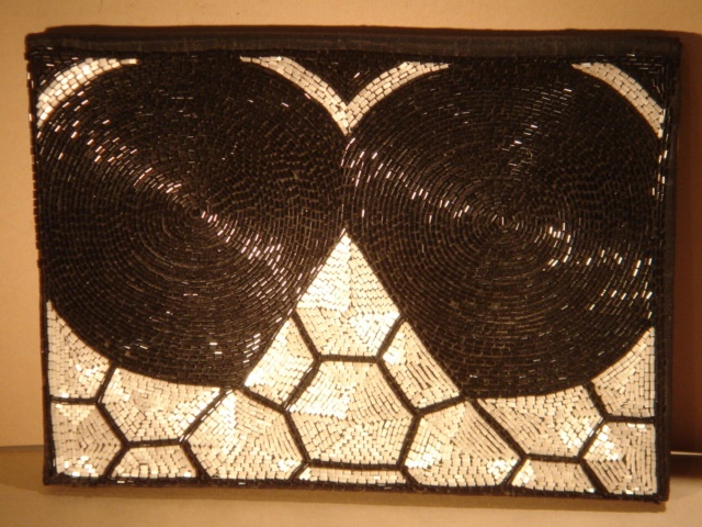 ART DECO BLACK AND WHITE SEQUINED CLUTCH EVENING HANDBAG 20 CM WIDE