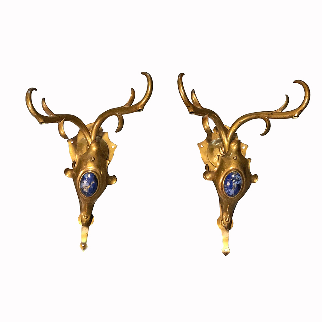 ART NOUVEAU BRASS WALL LIGHT / SCONCE TWO BRANCH WITH OVAL BLUE MARBLE PLAQUE 30 CM HIGH 24 CM WIDE (X2)