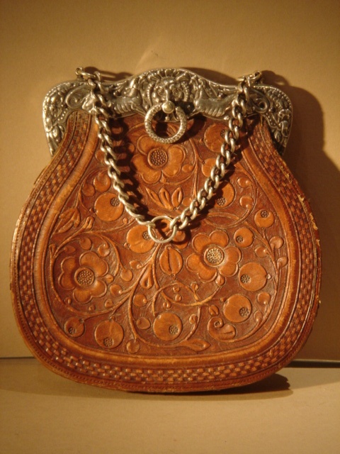 ART NOUVEAU EMBOSSED TAN LEATHER HANDBAG WITH ORNATE SILVER TOP 18 CM WIDE