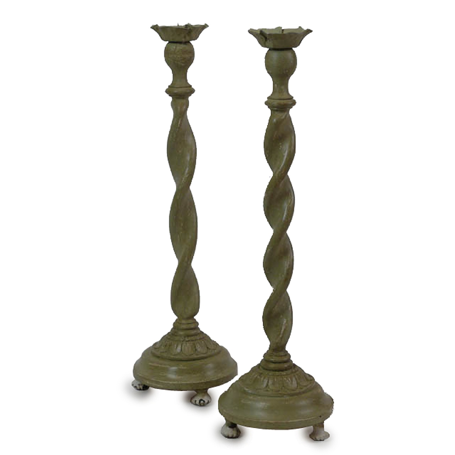 BARLEY TURNED WOOD CANDLESTICK CELADON GREEN DISTRESSED FINISH 58 CM HIGH 17 CM WIDE (X2)