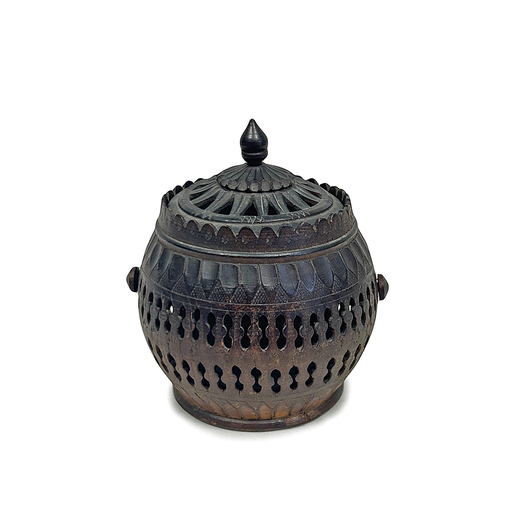 BARREL SHAPE WOODEN BOX WITH PIERCED CARVING GEOMETRIC DECORATION AND LID 11 CM HIGH / 10 CM DIAMETER