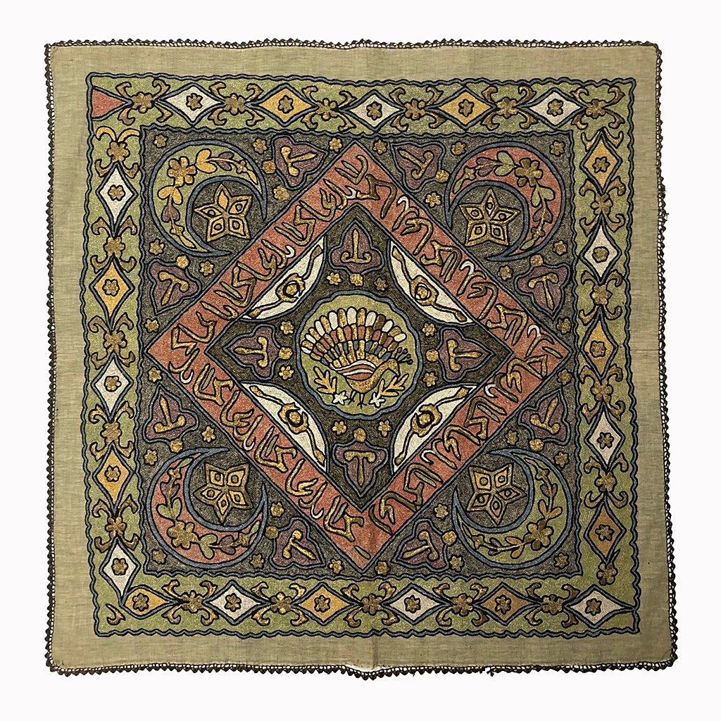 BEIGE LINEN TABLECLOTH WITH BRIGHT METALLIC EMBROIDERY ISLAMIC SYMBOLS AND CENTRAL PEACOCK MEDALLION 3'2/i X 3'2/i