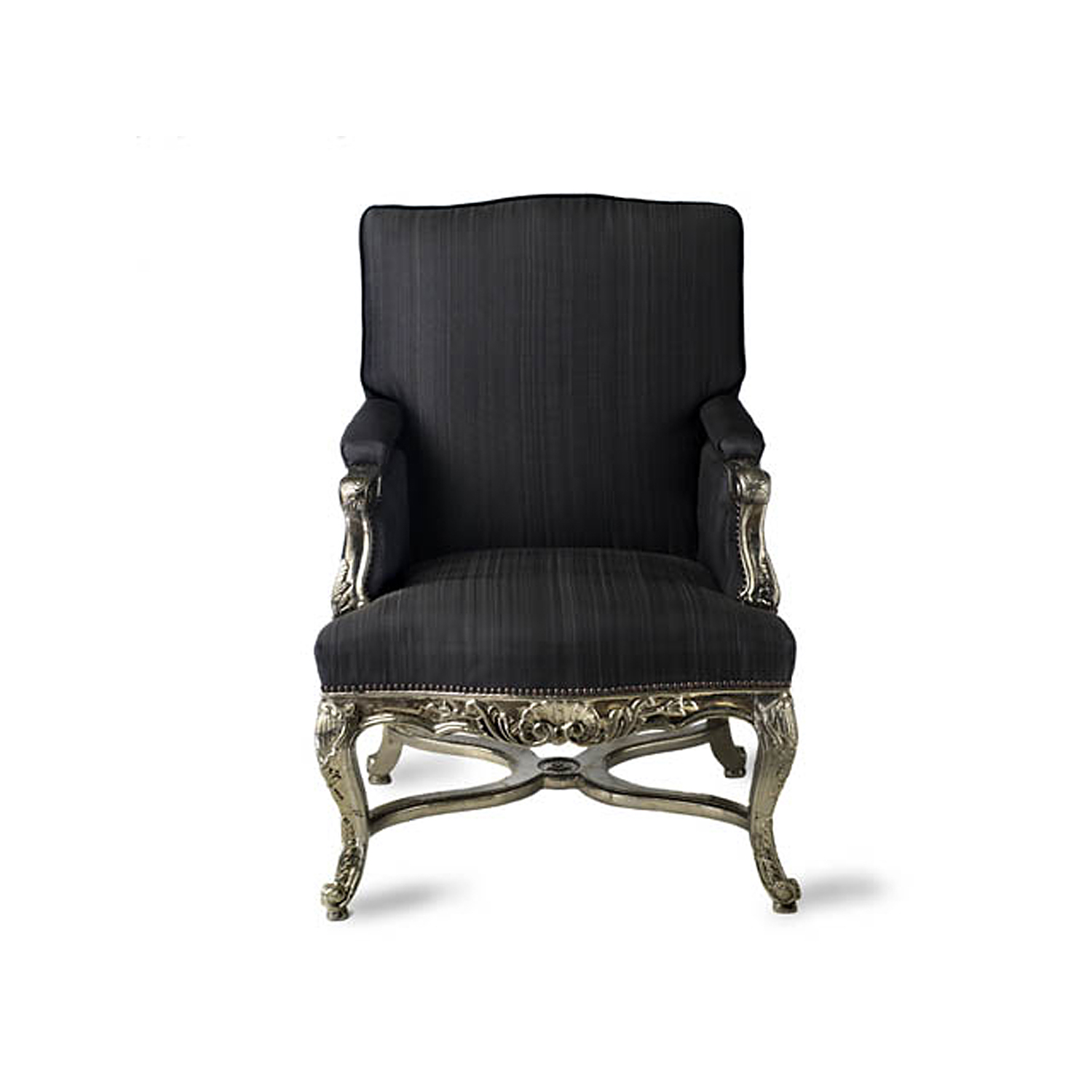 BERGER / ARMCHAIR LOIUS XV STYLE SILVER COVERED CARVED WOOD WITH BLACK HORSE HAIR UPHOLSTERY 102 CM HIGH (X4)