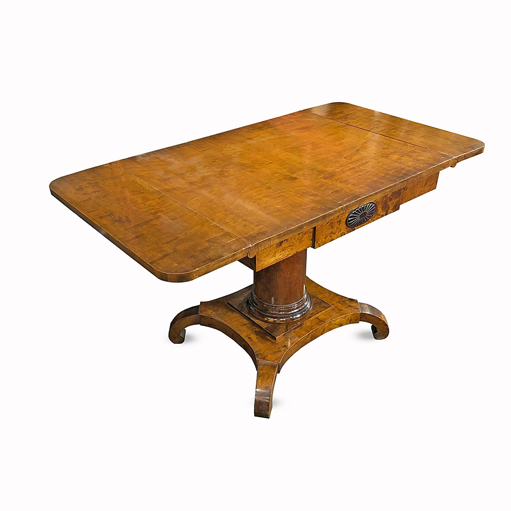 BIEDERMEIER SATINWOOD DROP LEAF SOFA TABLE WITH PEDESTAL BASE AND OVAL EBONY FLUTED MEDALION 75 CM HIGH 133 CM WIDE 72 CM DEEP