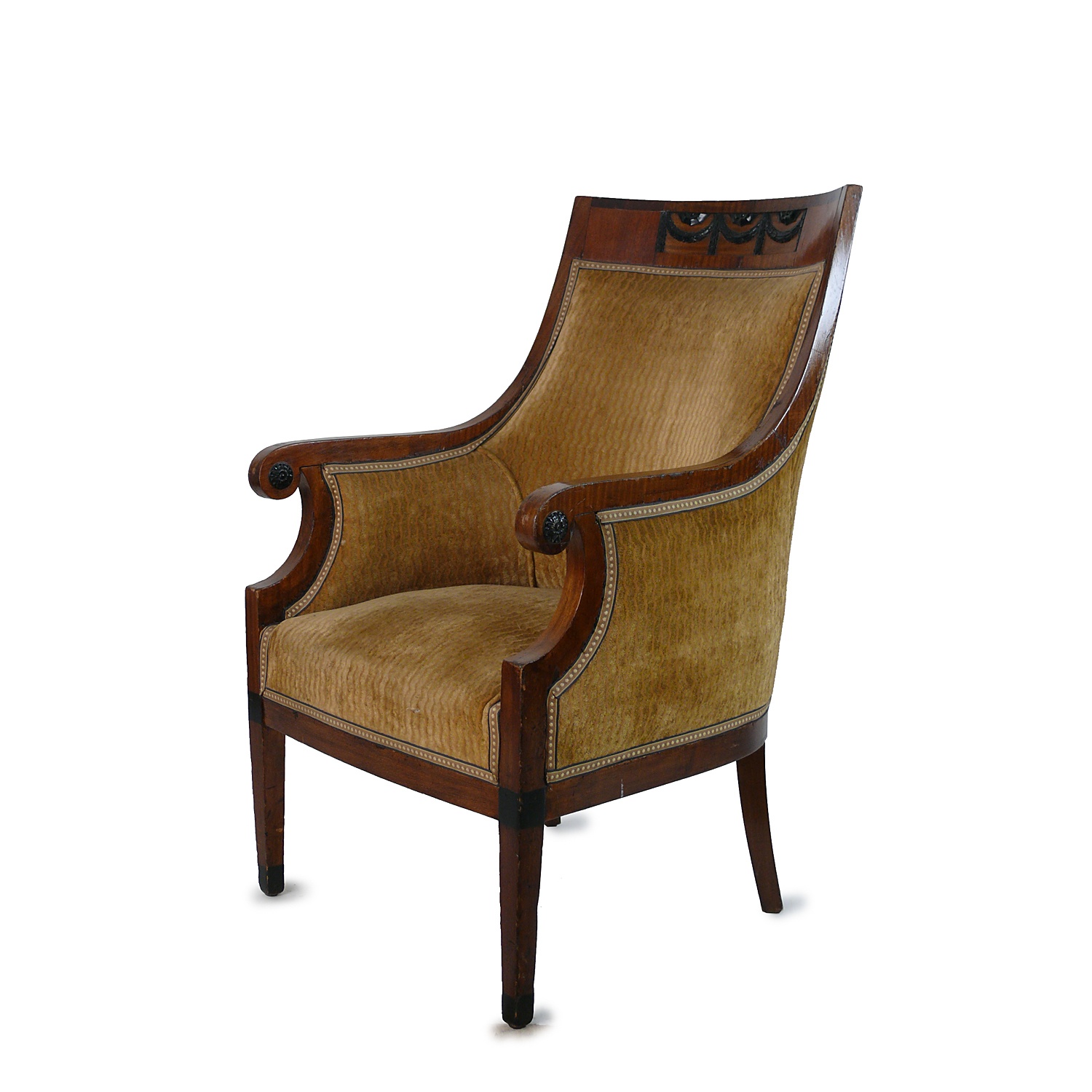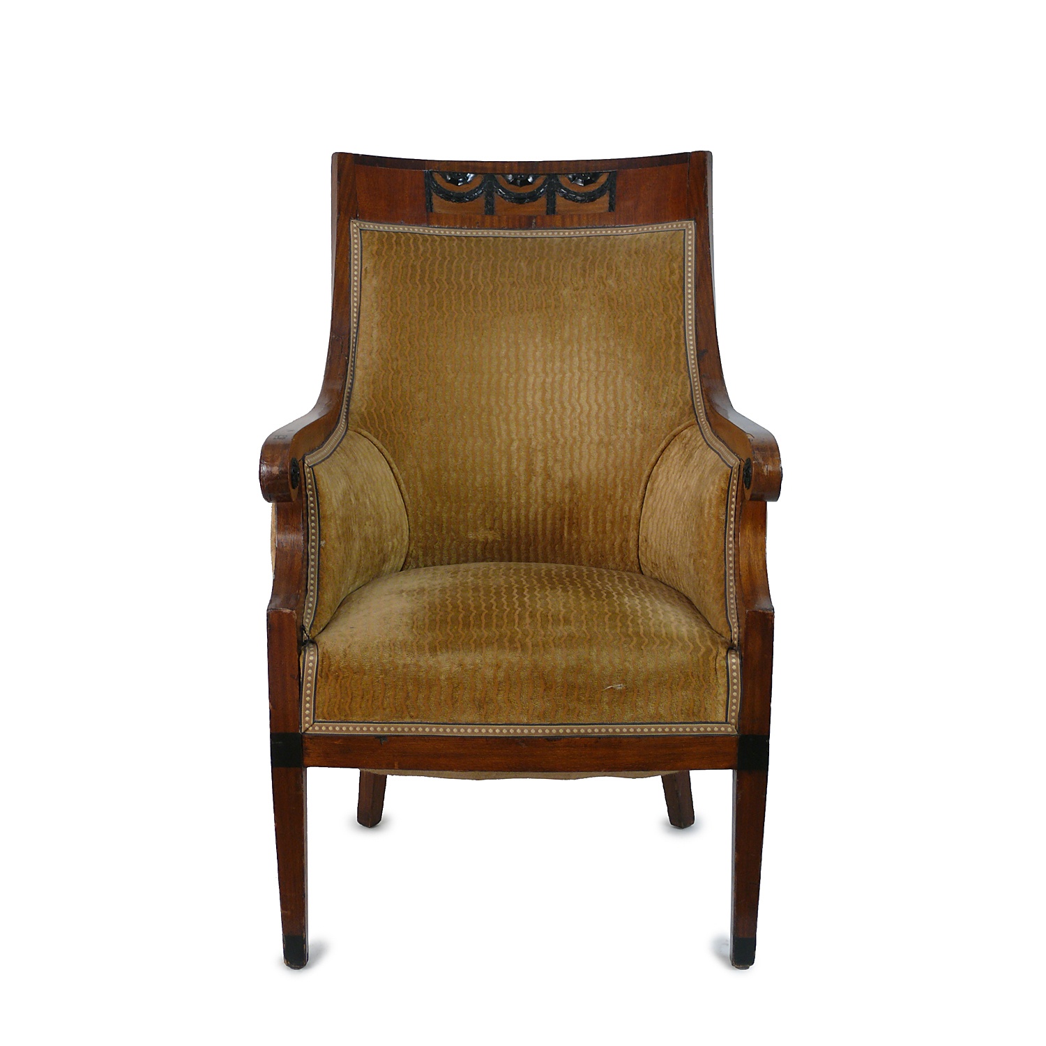 BIEDERMEIER SATINWOOD HIGH BACK TUB ARM CHAIR PALE COFFEE UPHOLSTERY 107 CM HIGH 68 CM WIDE 76 CM DEEP