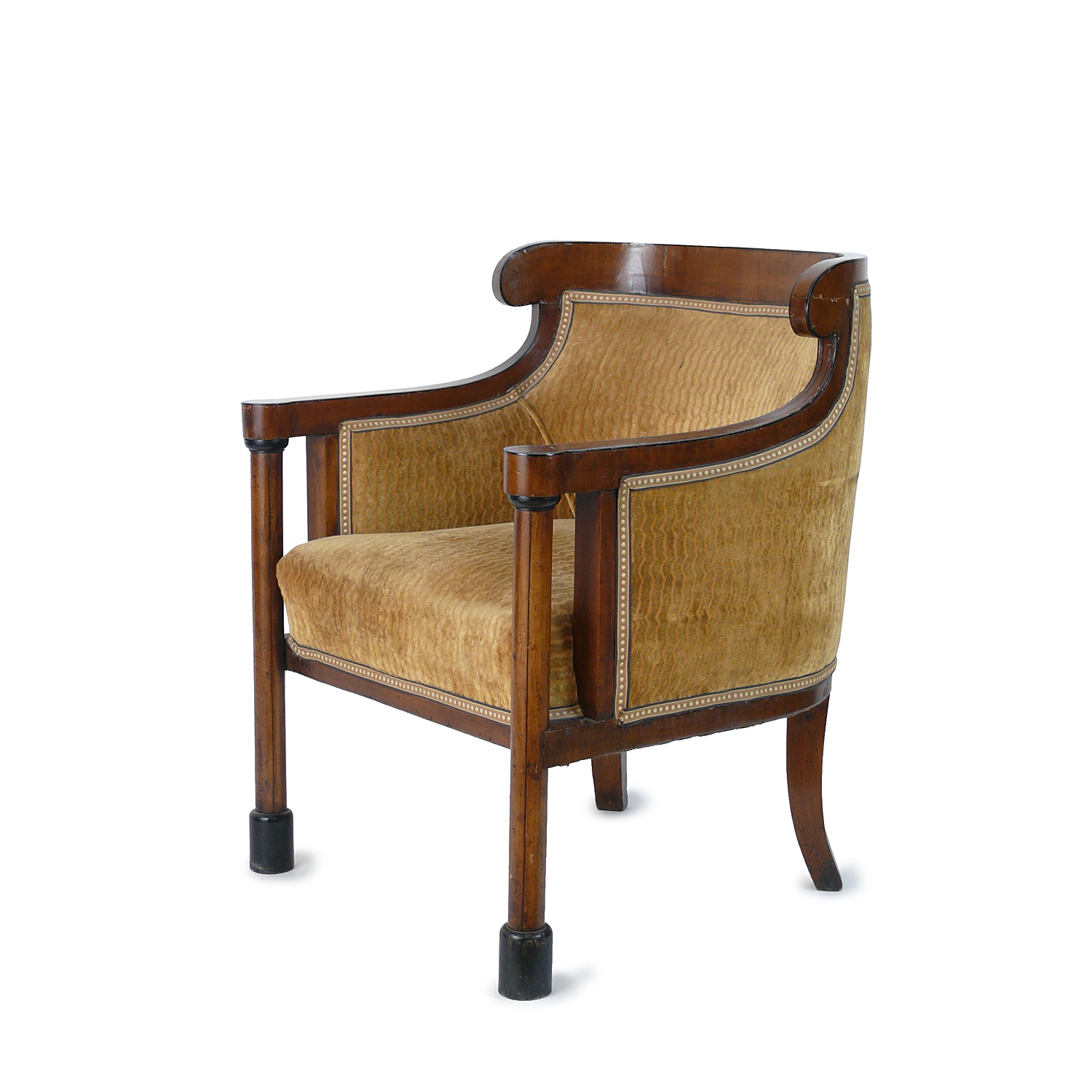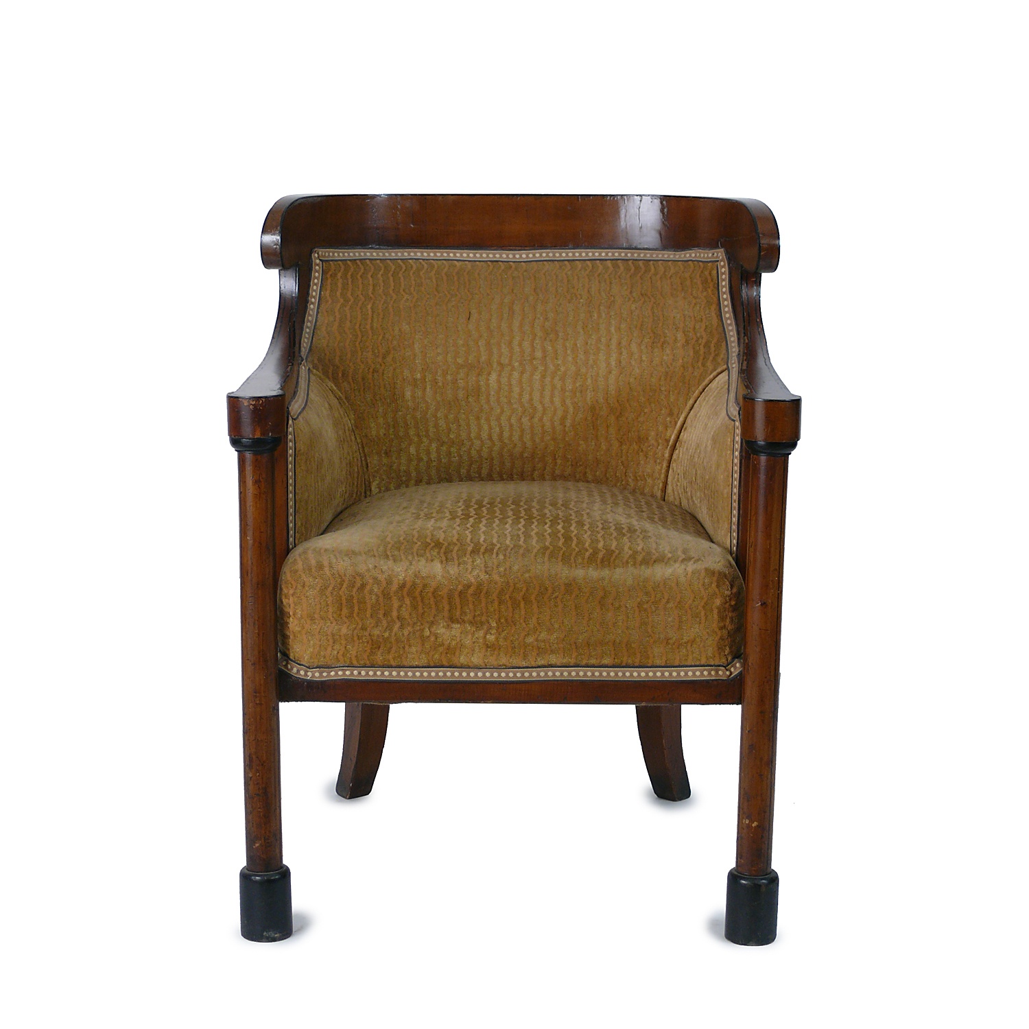 BIEDERMEIER SATINWOOD TUB ARM CHAIR PALE COFFEE UPHOLSTERY 82 CM HIGH 64 CM WIDE 67 CM DEEP