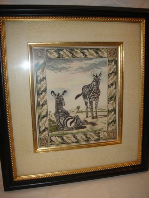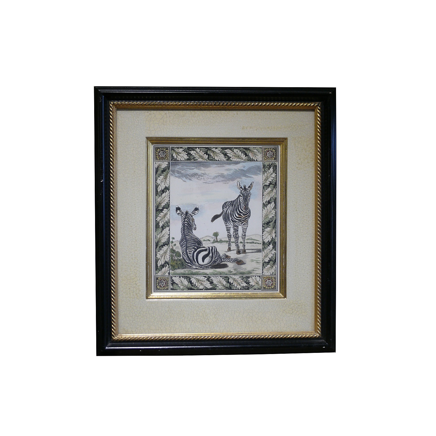BLACK AND GOLD FRAMED COLOURED ENGRAVING OF A ZEBRA (X2)