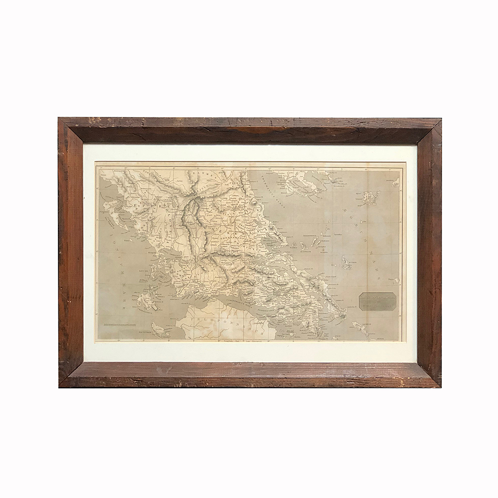BLACK AND WHITE ANTIQUE MAP OF GRECIA IN A PLAIN WOOD FRAME
