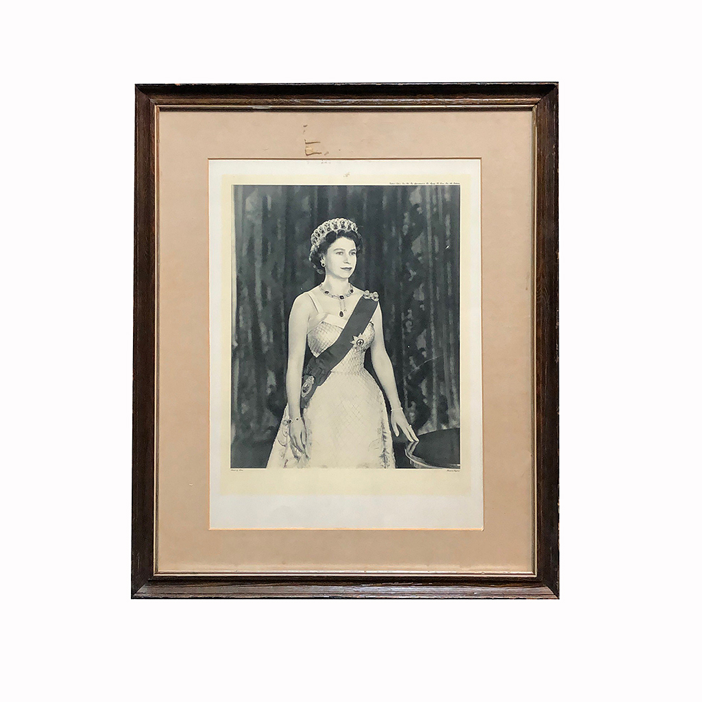 BLACK AND WHITE PHOTOGRAPH OF QUEEN ELIZABETH II BY BARON IN A DARK OAK FRAME 23 X 18