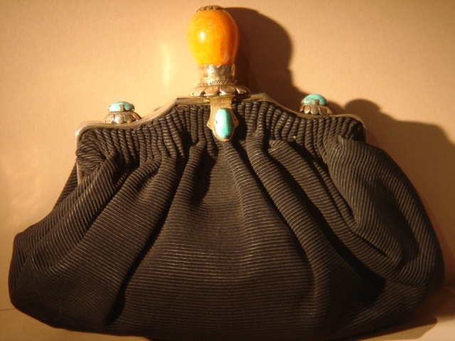 BLACK CORD CLUTCH HANDBAG WITH AMBER AND TURQUOISE STONE DECORATION 26 CM WIDE