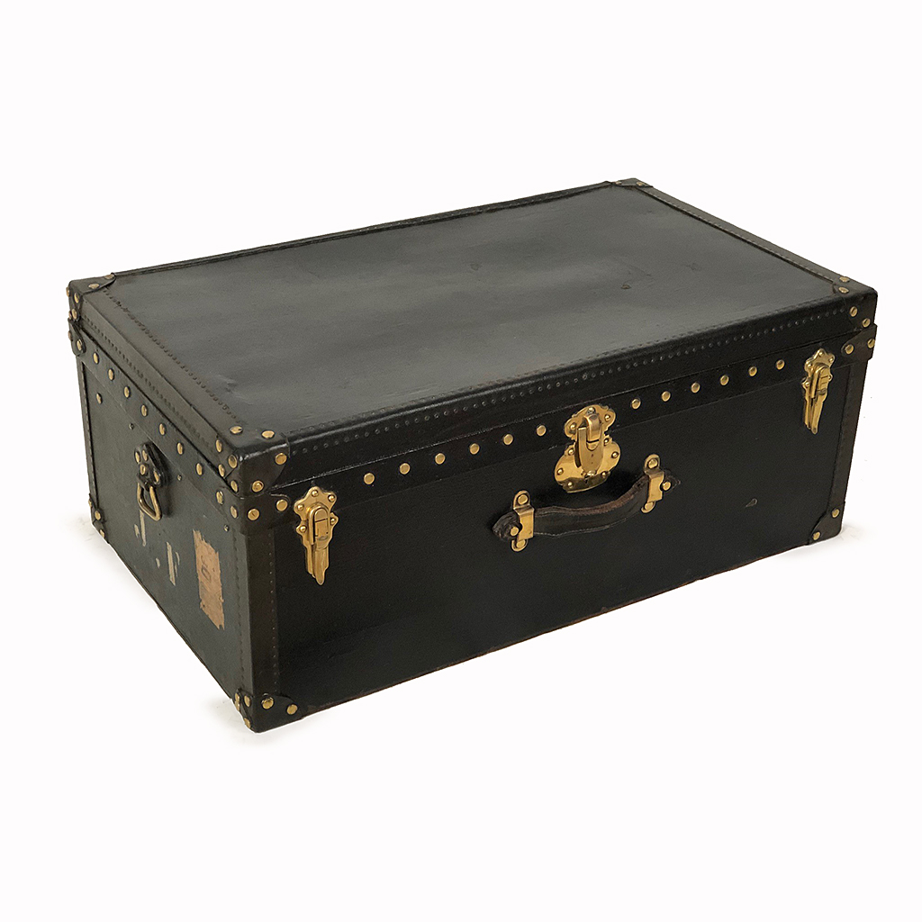 BLACK FRENCH TRAVEL TRUNK WITH BRASS FITTINGS 33 CM HIGH 81 CM WIDE 47 CM DEEP