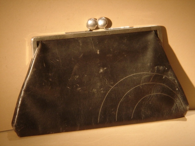 BLACK LEATHER CLUTCH HANDBAG WITH CHROME BUTTON CLASP 27 CM WIDE