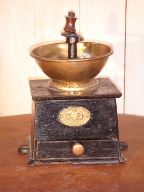 BLACK METAL AND BRASS LARGE COFFEE GRINDER