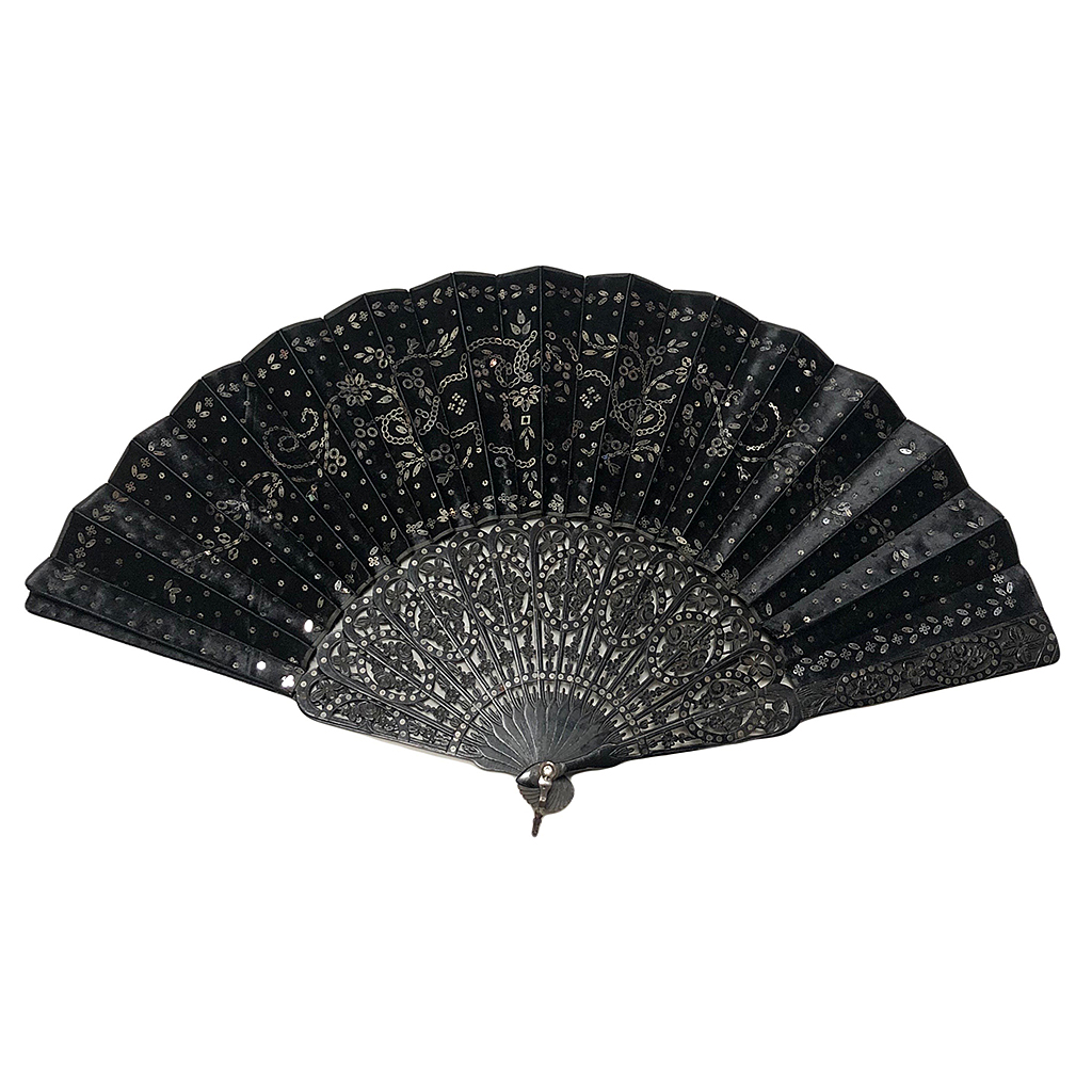 BLACK SILK AND SEQUIN GARLAND DESIGN FAN WITH CARVED EBONY STICKS WITH INLAY 24 CM LONG