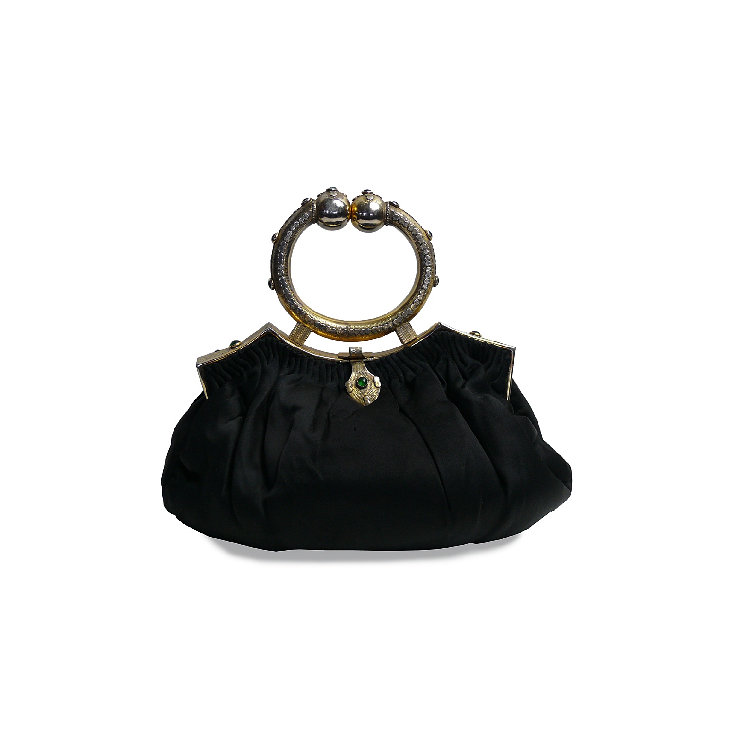 BLACK SILK HANDBAG WITH JEWEL ENCRUSTED GILT METAL HANDLES BENARES WARE 1920'S