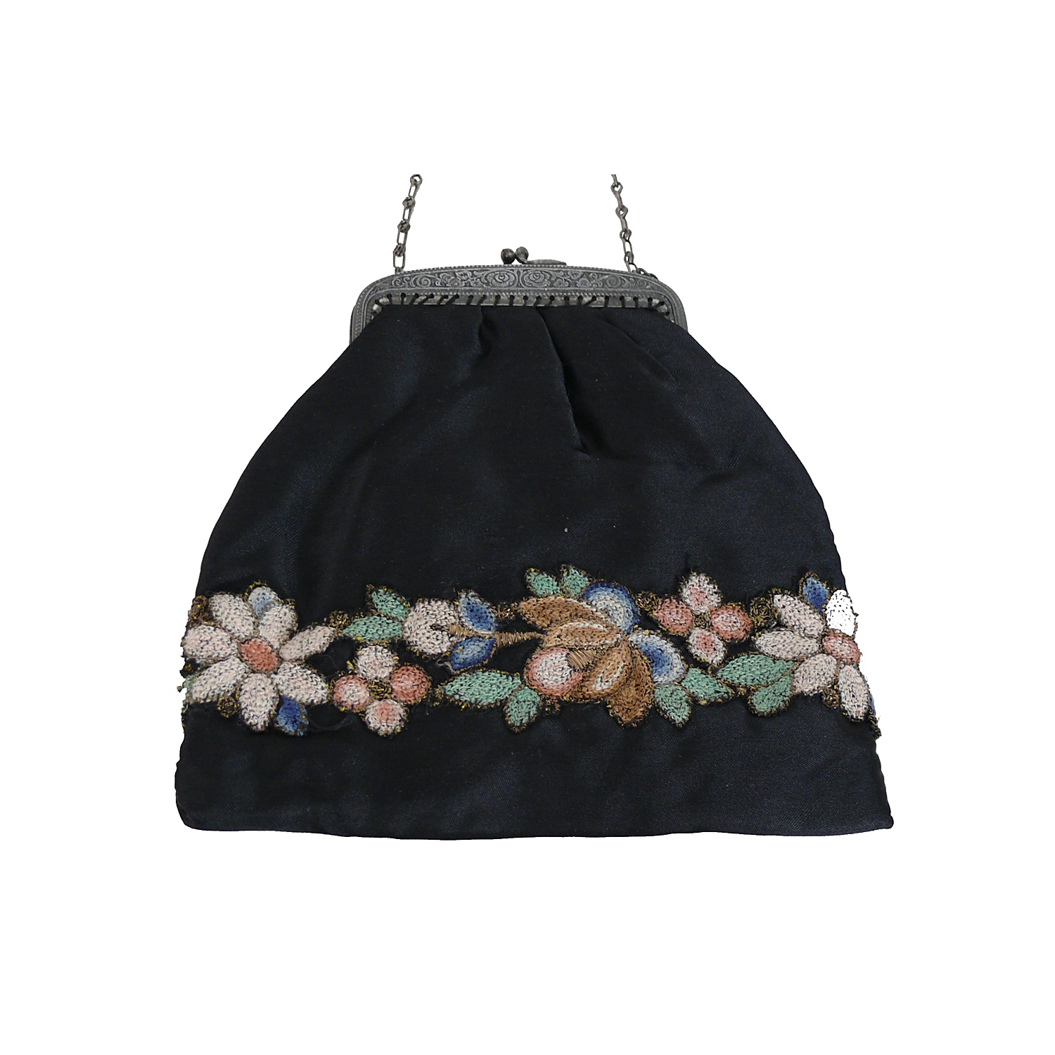 BLACK SILK PURSE HANDBAG WITH FLORAL EMBROIDERY AND CHAIN HANDLE