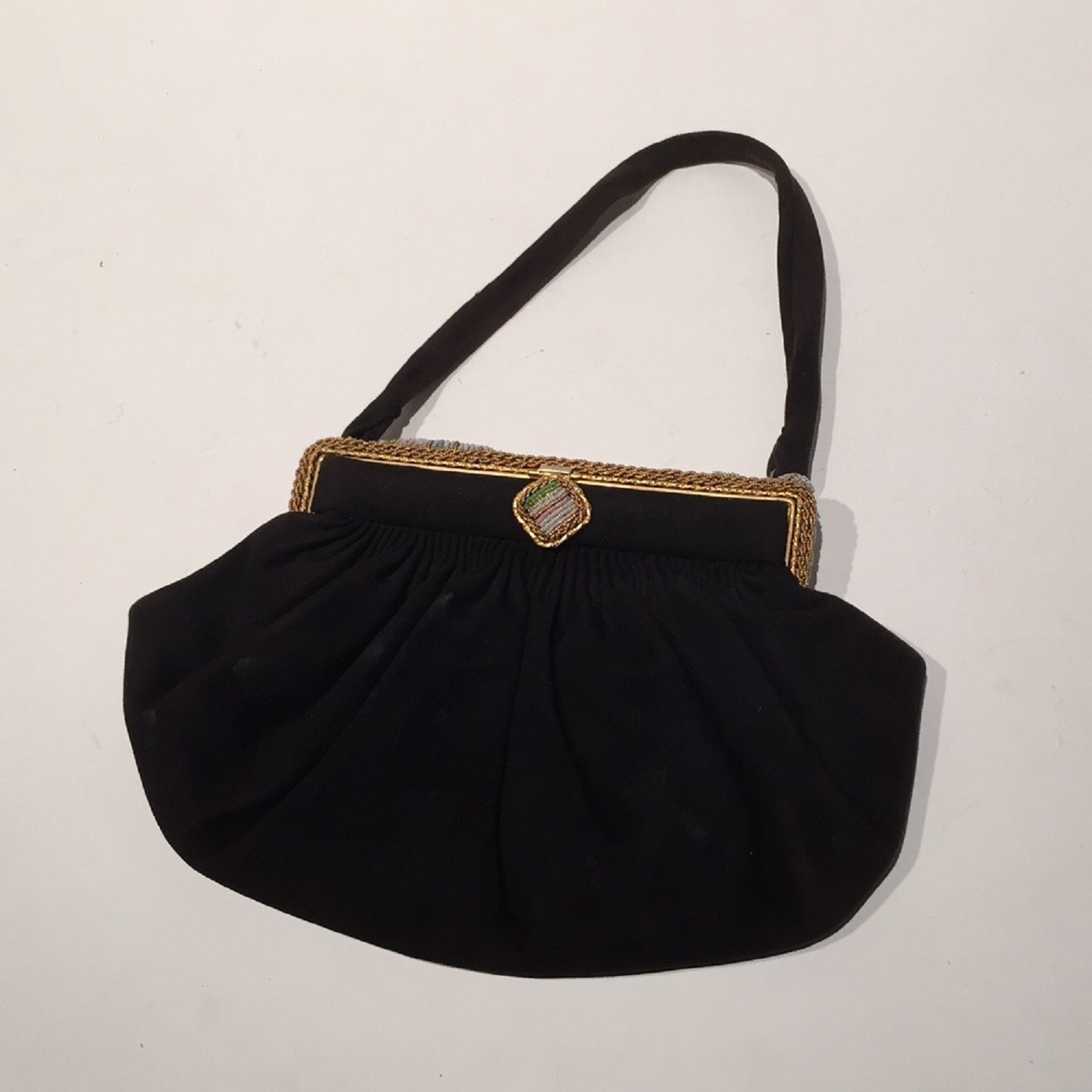 BLACK SUEDE EVENING HANDBAG WITH ELABORATE GILT BEADED AND ENAMELLED FRAME AND GLASP