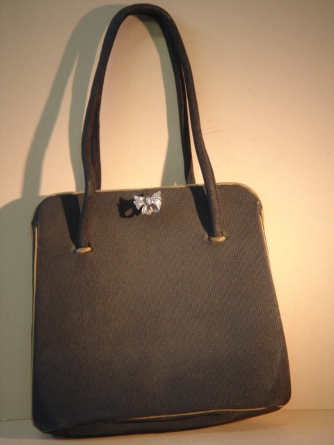 BLACK TWILL HANDBAG WITH DIAMANTE BUTTERFLY CLASP 21 CM WIDE