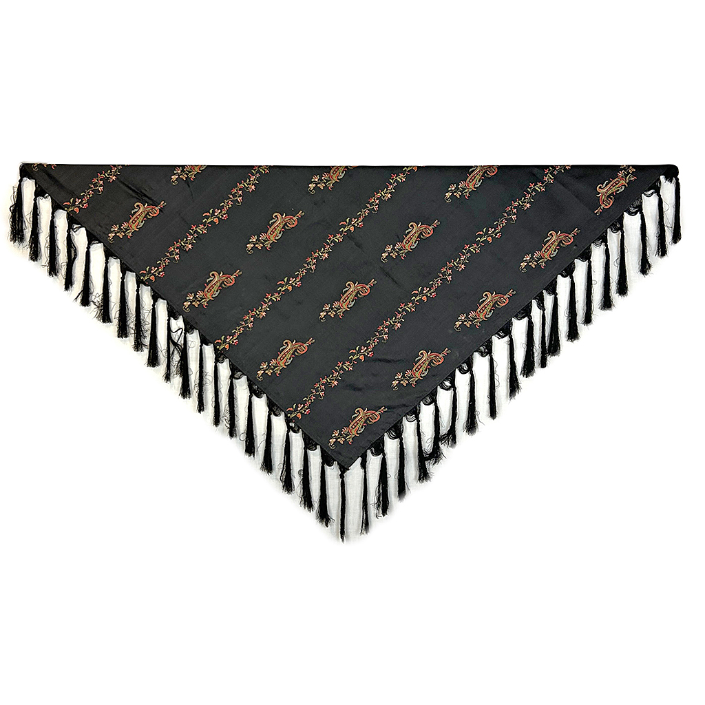 BLACK WOVEN SILK SHAWL WITH MULTICOLOURED FLORAL AND PAISLEY STRIPE DESIGN AND FRINGE