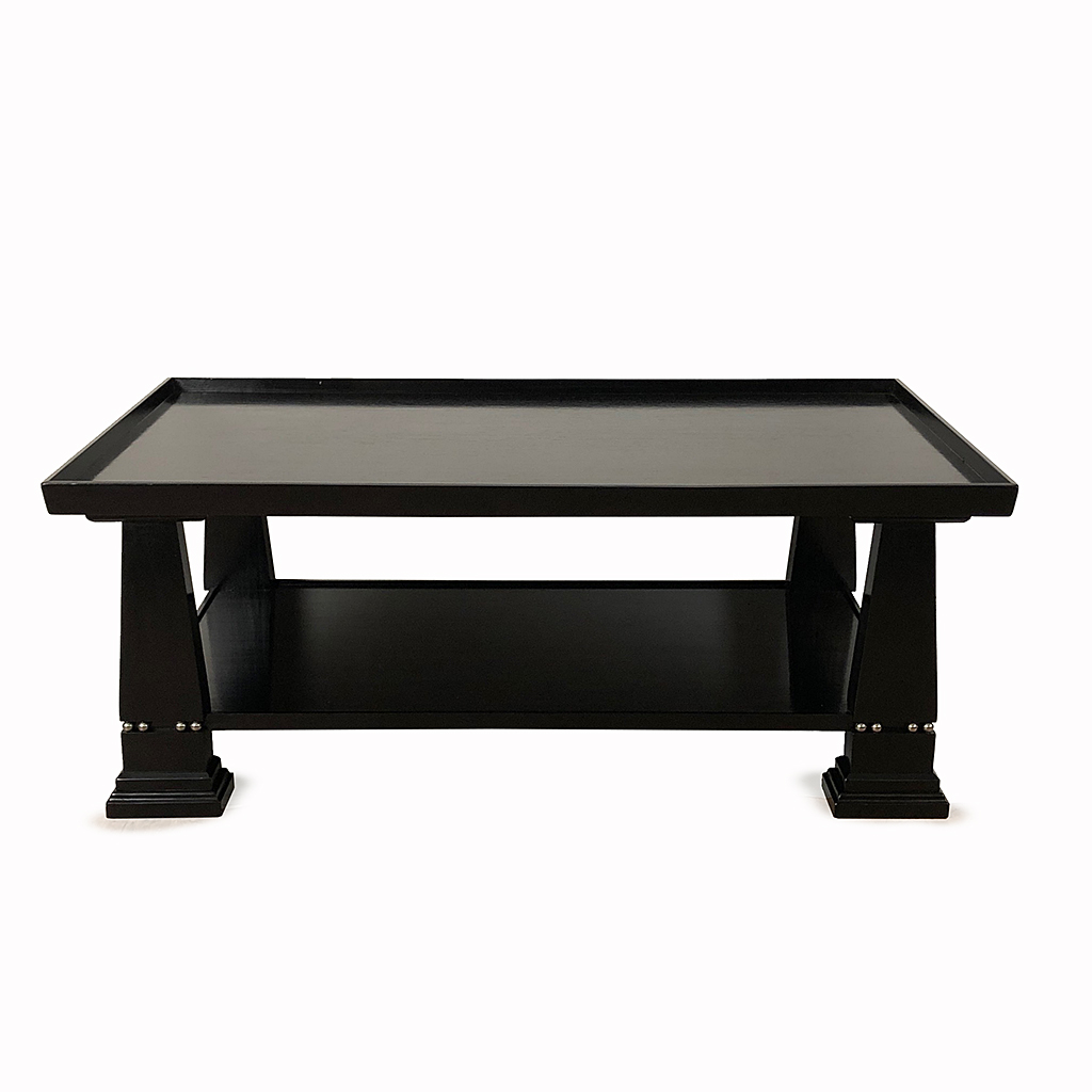 BLENHEIM EBONISED OAK TWO TIER COFFEE TABLE WITH OBELISK LEGS 49 CM HIGH 124 CM LONG 72 CM WIDE