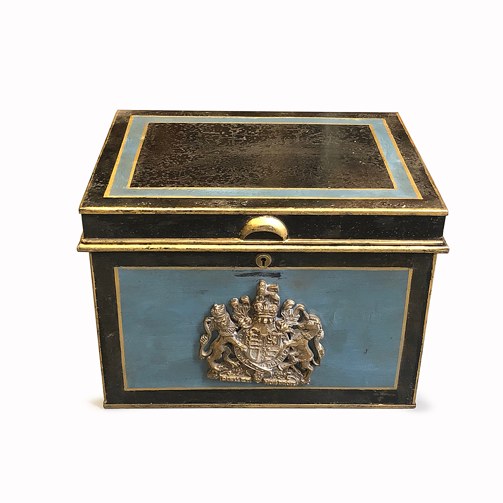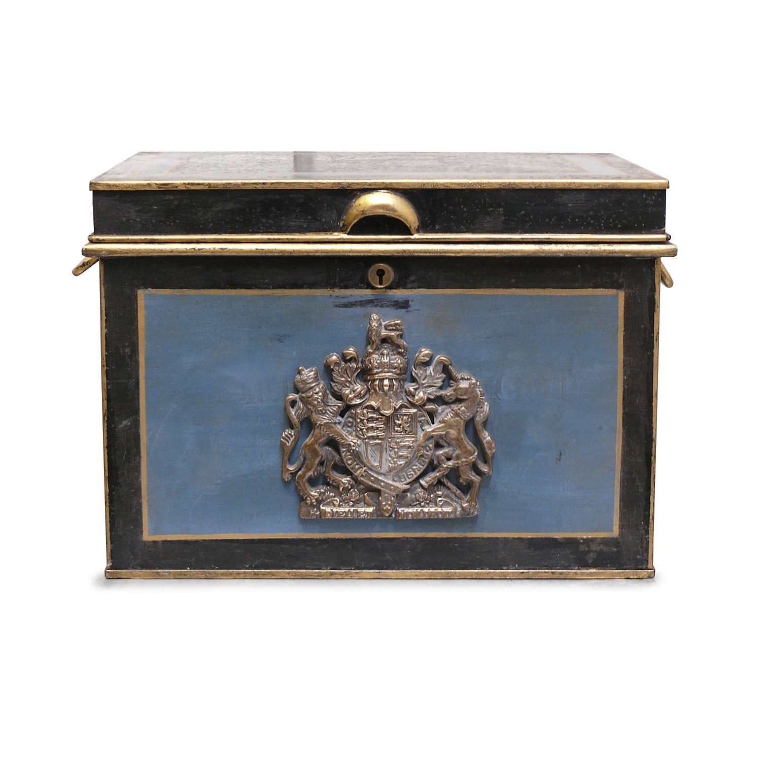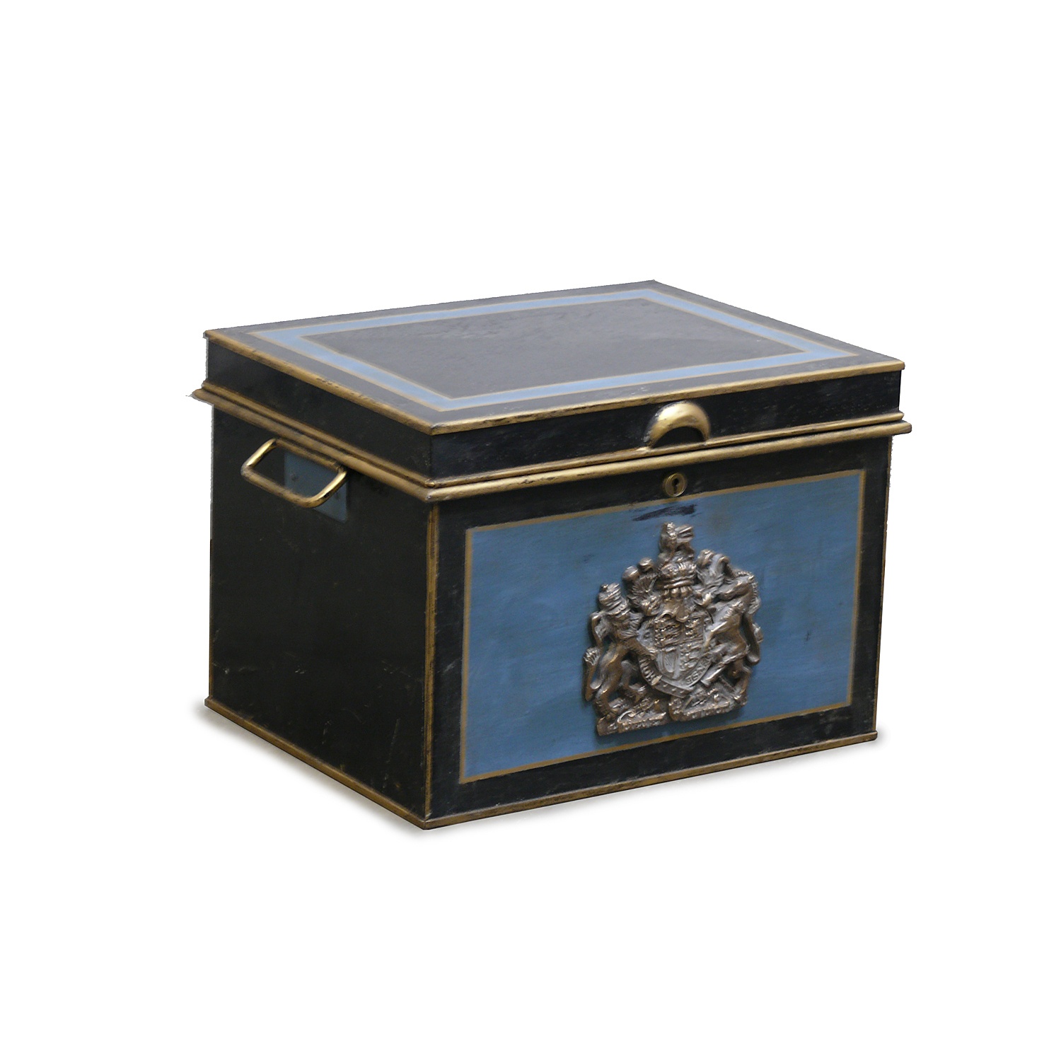 BLUE AND BLACK TIN DEED BOX WITH BRASS ROYAL CREST / COAT OF ARMS 46 CM LONG 32 CM HIGH 35 CM DEEP