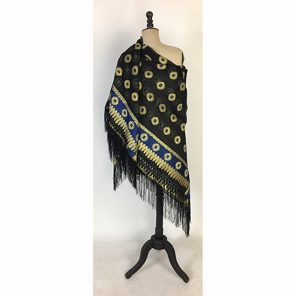 BLUE BLACK AND GOLD SILK SHAWL WITH FRINGING 19TH CENT. 5'2/i X 5'2/i