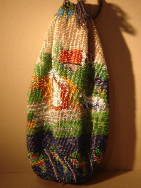 BLUE CREAM AND GREEN BEADED DRAW STRING HANDBAG 15 CM WIDE
