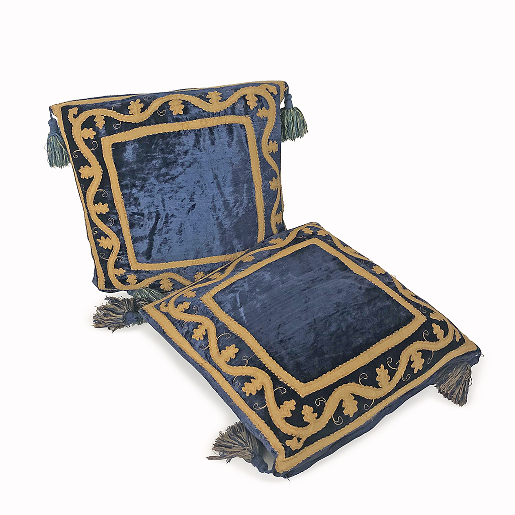 BLUE CRUSHED VELVET CUSHION WITH GOLD APPLIQUE AND CORNER TASSELS (SET)
