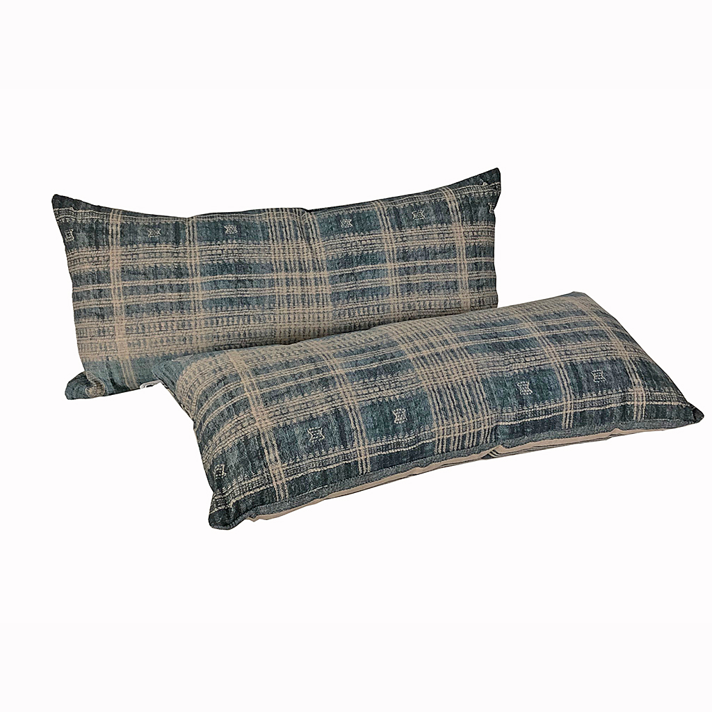 BLUE LINEN CUSHION TWO TONE ETHNIC CHECK 30 CM X 72 CM (X2)