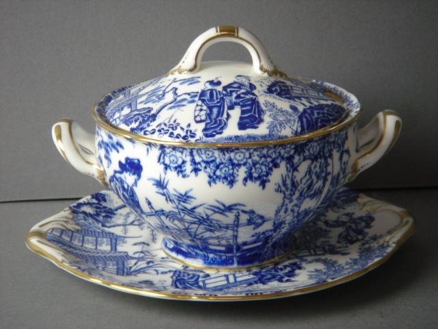 BLUE MIKADO SAUCE TUREEN WITH LID AND STAND CROWN DERBY BY ROYAL DOULTON JAPANESE DESIGN (X2)