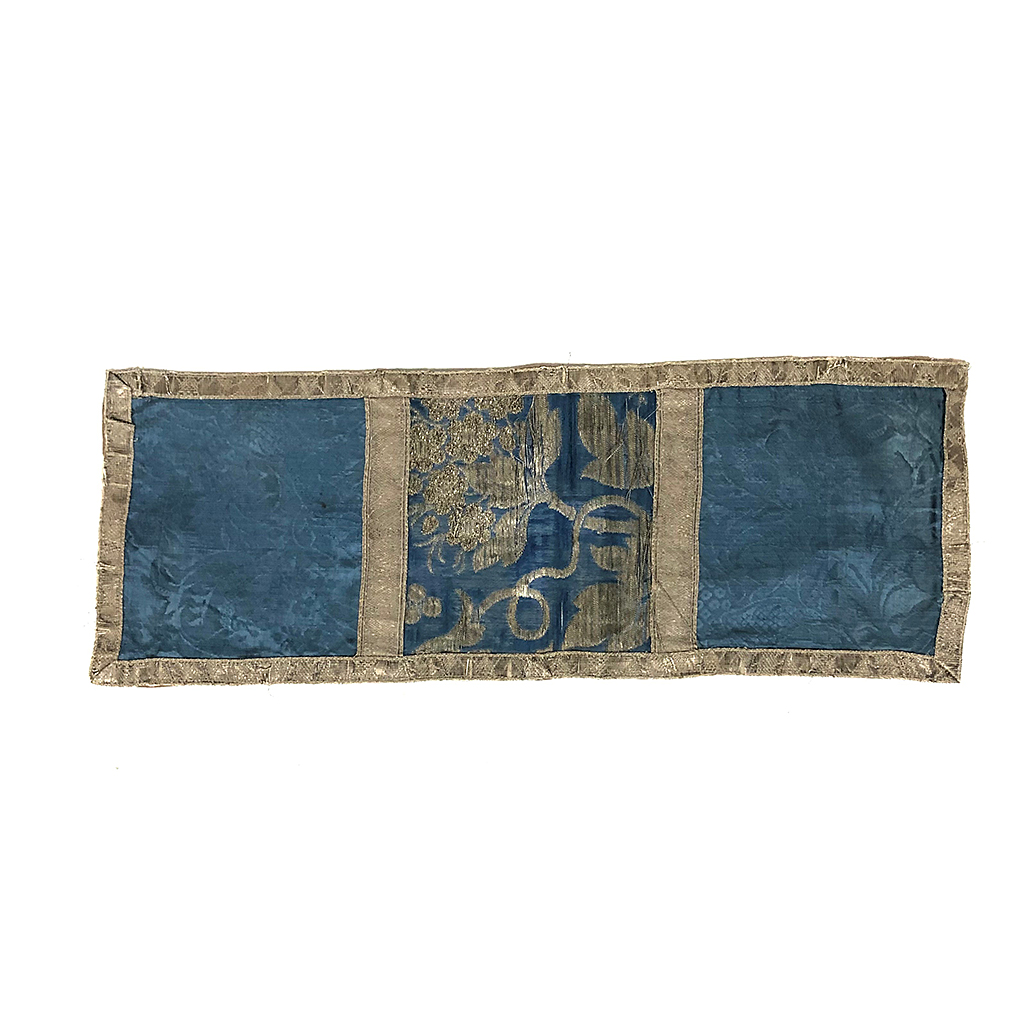 BLUE SILK DAMASK AND METALLIC EMBROIDERED RUNNER 46 CM X 17 CM