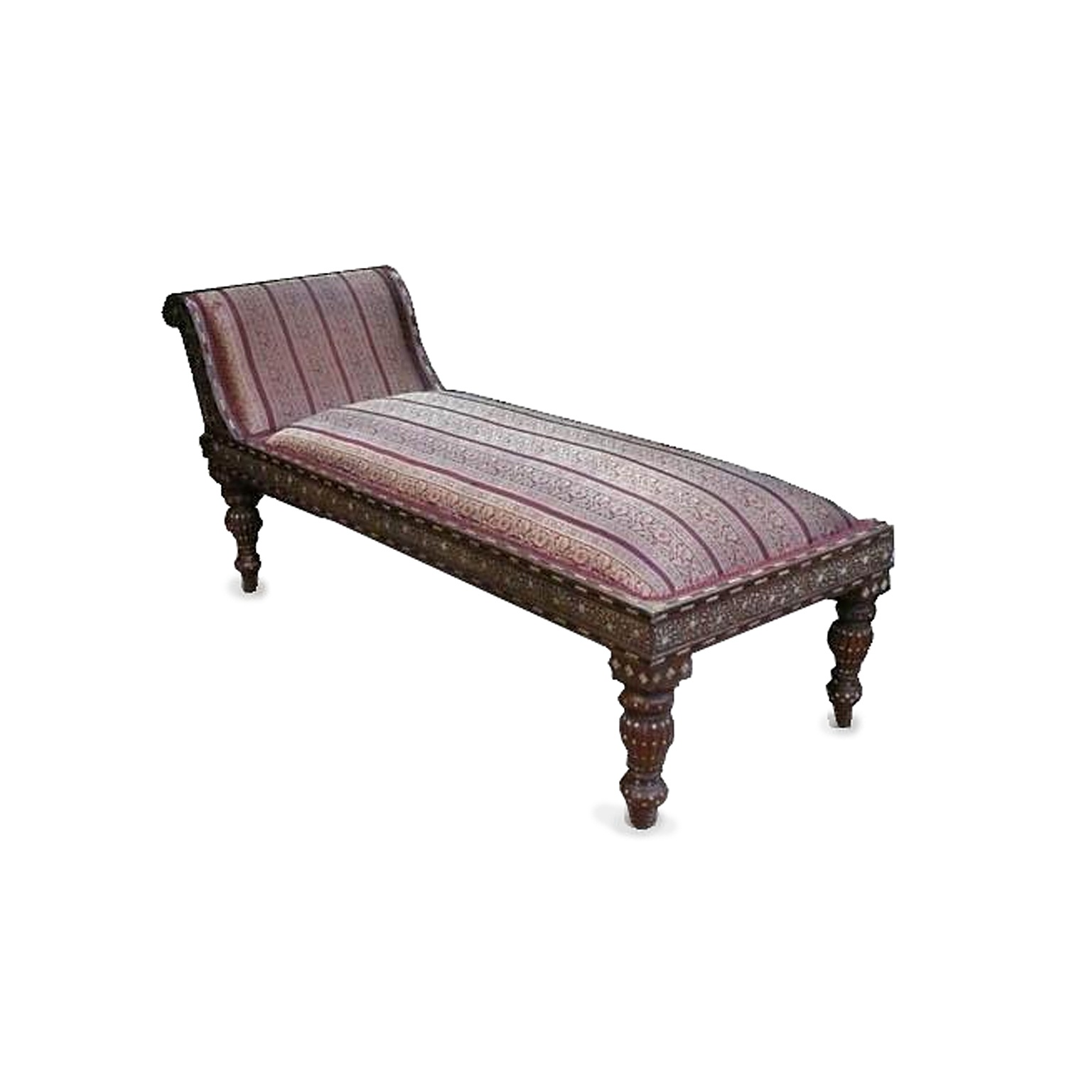 BONE INLAID TEAK CHAISE LONGUE / DAY BED WITH RED STRIPE SILK UPHOLSTERY 164 CM LONG 61 CM WIDE 72 CM HIGH