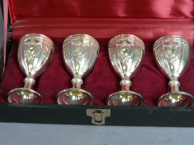 BOXED PRESENTATION SET OF FOUR SILVER EGG CUPS / CORDIAL GOBLETS 26 CM LONG