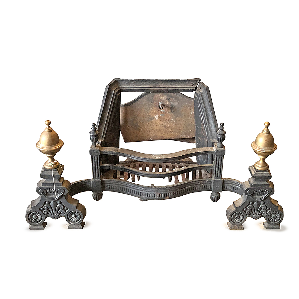 BRASS AND STEEL FIRE GRATE SERPENTINE FRONT WITH BRASS TOPPED FINIALS ENGLISH CIRCA 1910 42 CM HIGH 86 CM WIDE 45 CM DEEP