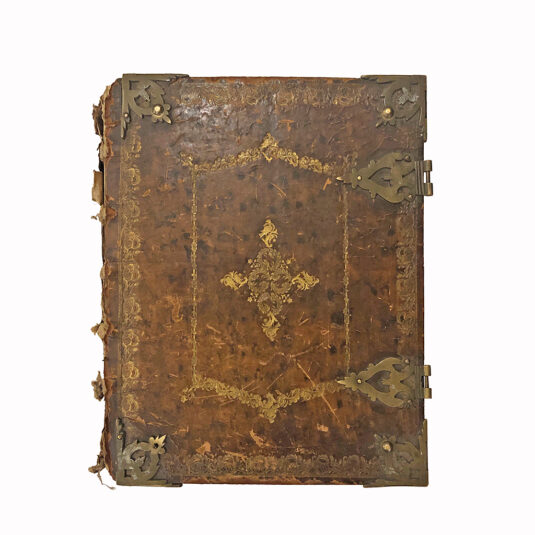 BRASS BOUND 17TH CENT. BIBLE TOOLED TAN LEATHER WITH CLASPS (X2)