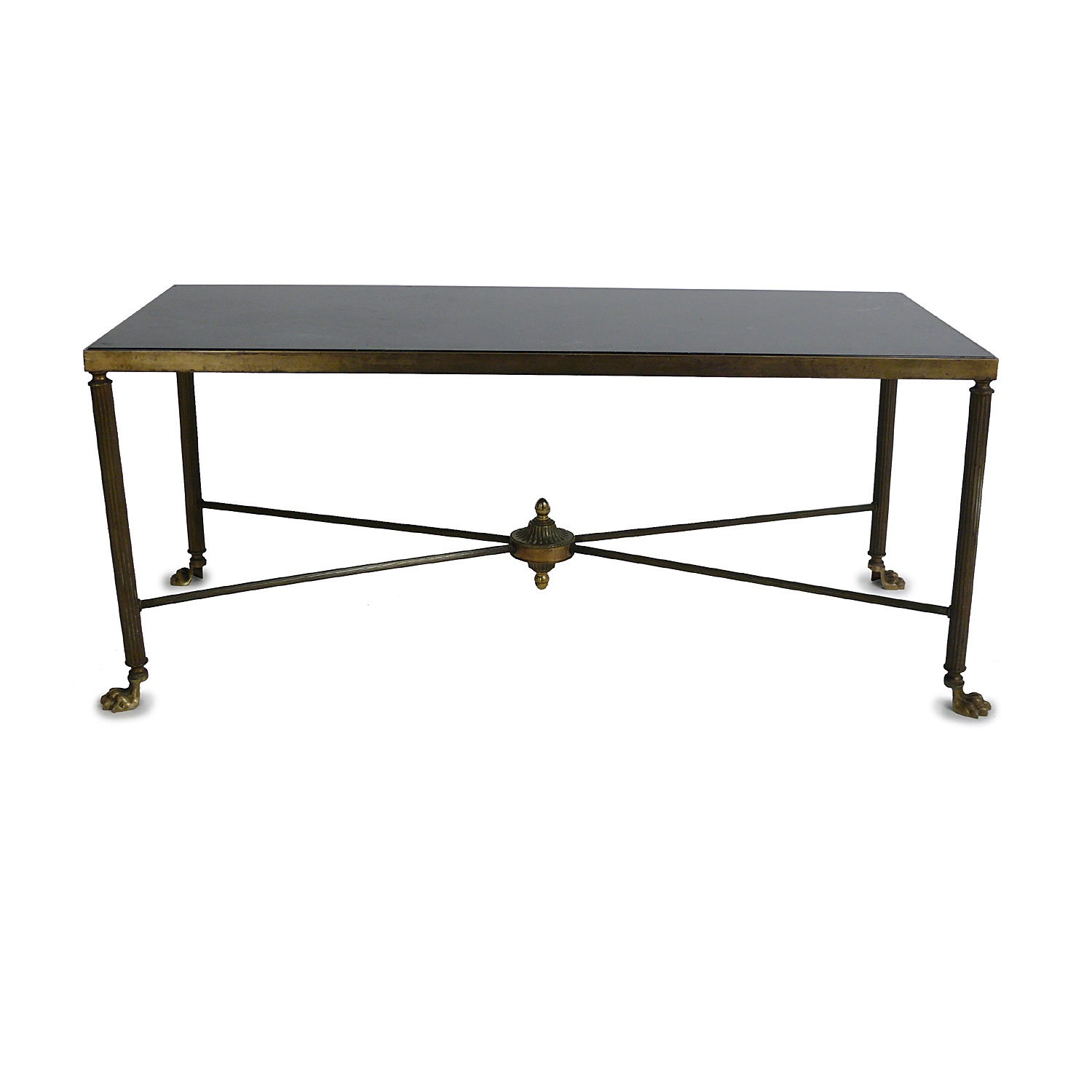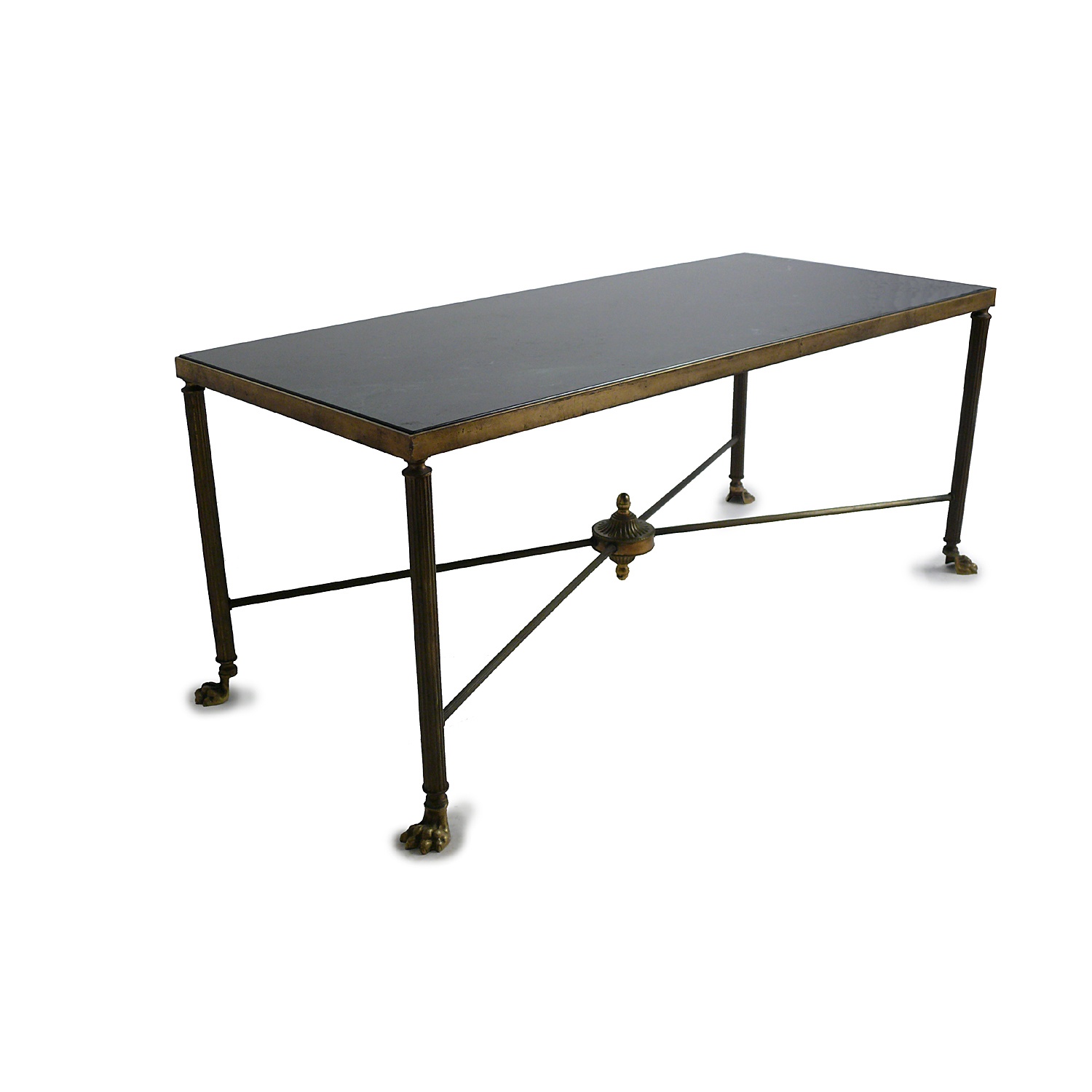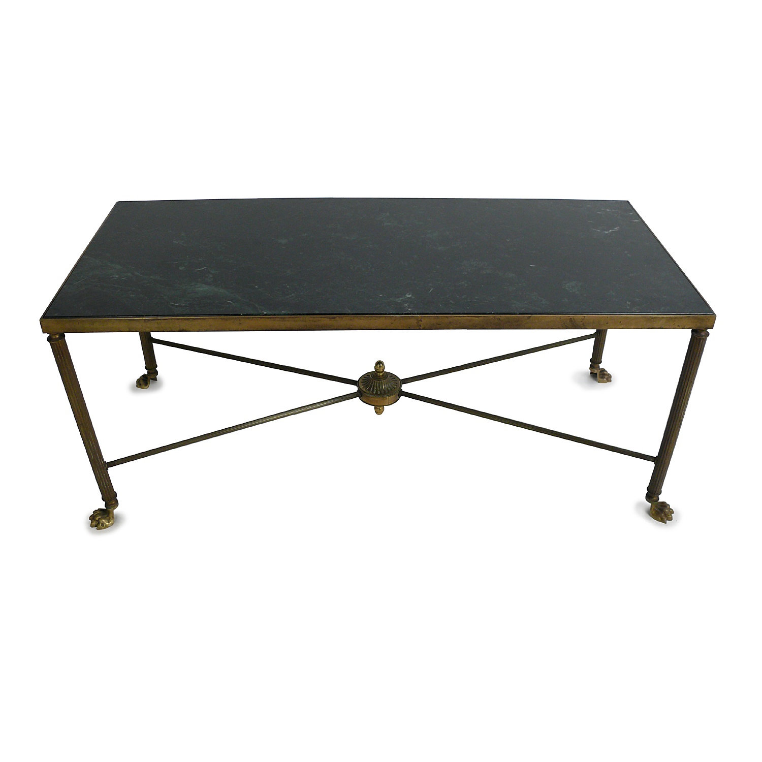 BRASS COFFEE TABLE WITH FLUTED LEGS LION PAW FEET AND A GREEN VERDI ANTIQUO MARBLE TOP 40 CM HIGH 92 CM LONG 41 CM WIDE (X2)