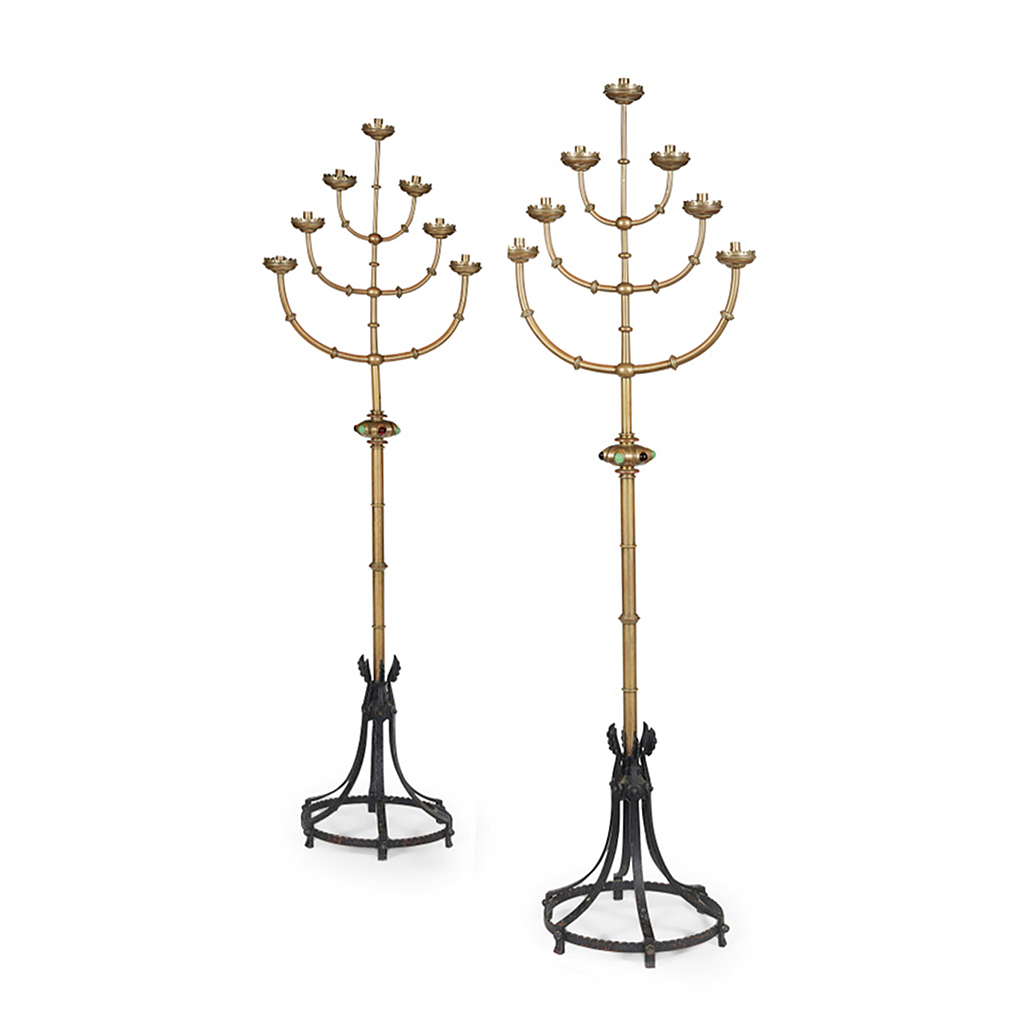 BRASS FLOORSTANDING CANDELABRA GOTHIC REVIVAL SEVEN BRANCH JEWELLED KNOPPED STEM WITH WROUGHT IRON BASE ENGLISH CIRCA 1880 194 CM HIGH 63 CM WIDE (X2)