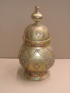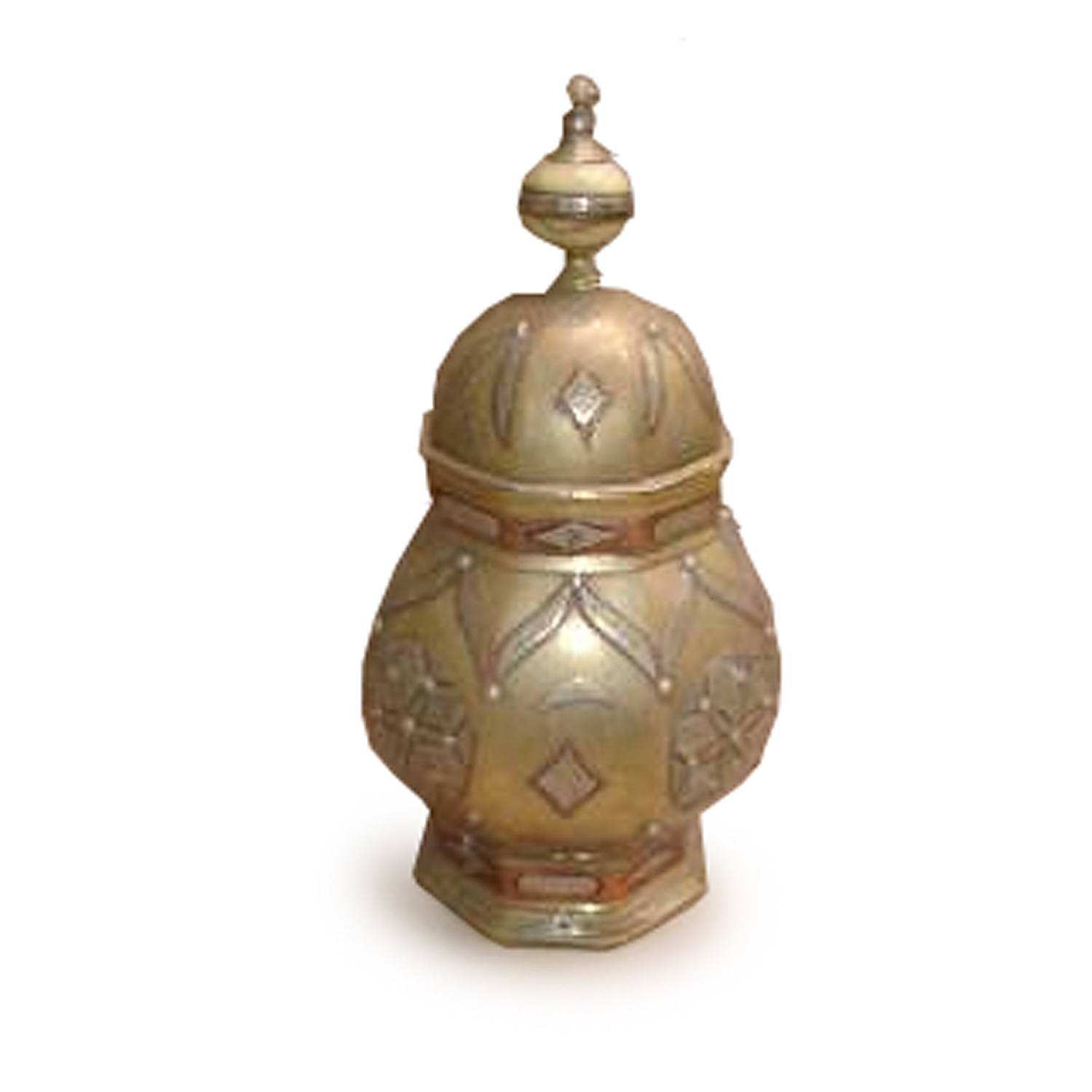 BRASS HEXAGONAL MOROCCAN VASE AND LID WITH APPLIED SILVER DESIGN 15/i HIGH