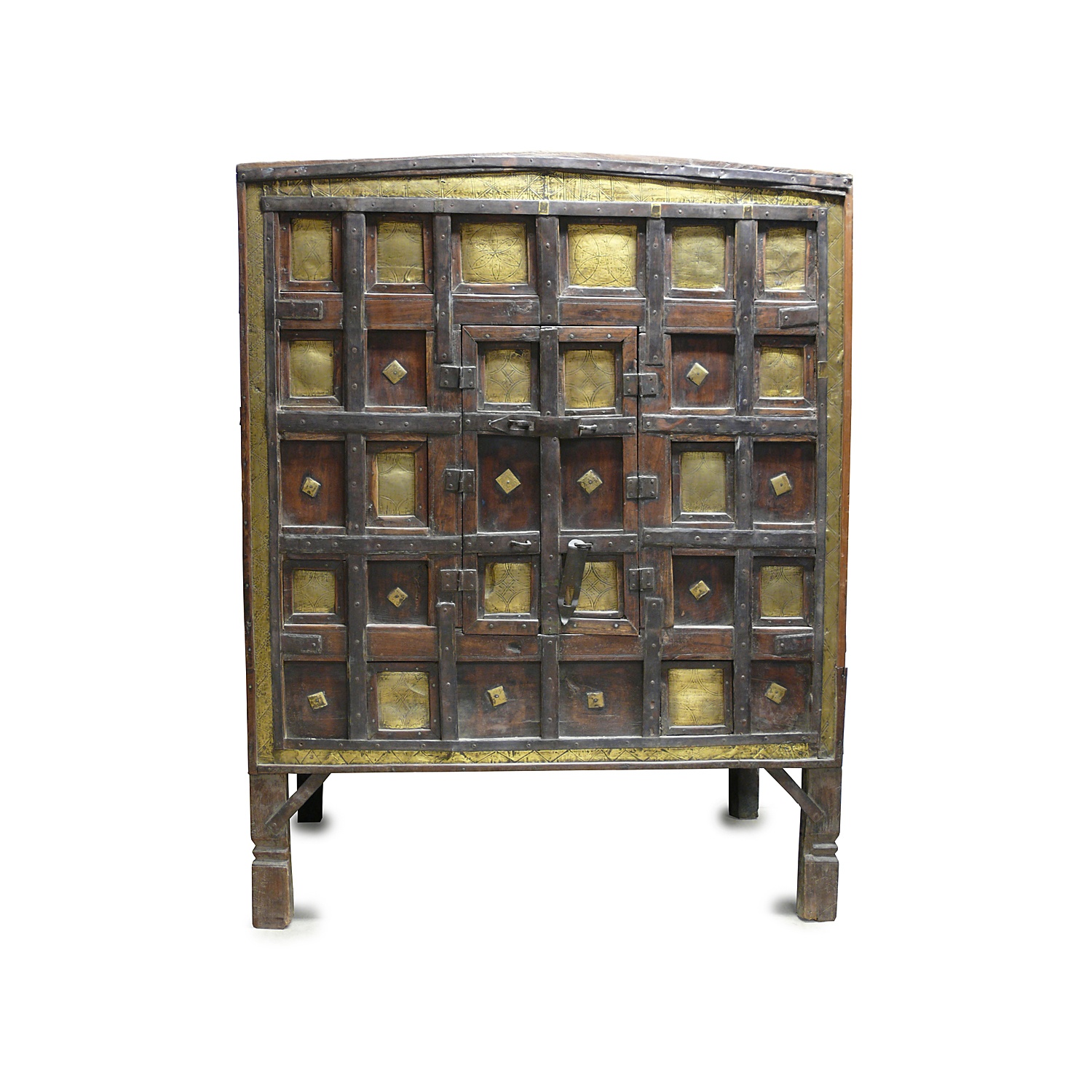 BRASS MOUNTED PUNJABI CUPBOARD / CHEST WITH SLIGHT PITCHED TOP 149 CM HIGH 116 CM WIDE 84 CM DEEP