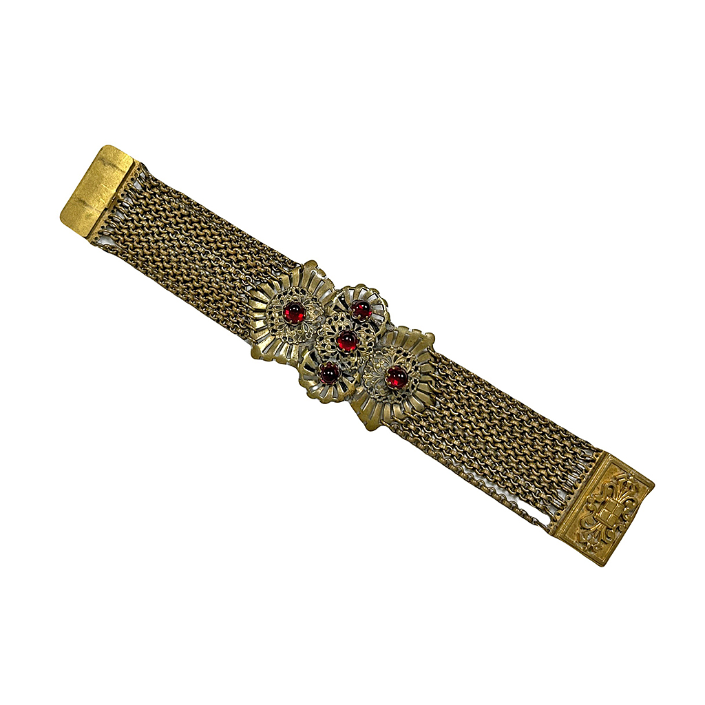 BRASS MULTI CHAIN BRACELET WITH RED PASTE STONE CENTRE