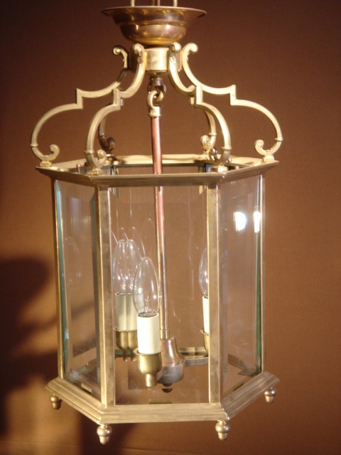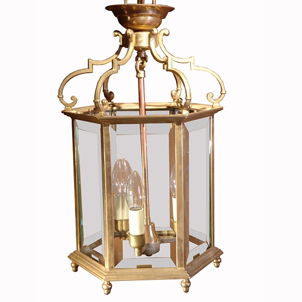 BRASS SIX SIDED HALL LANTERN WITH BEVELLED GLASS AND SCROLL WORK TOP
