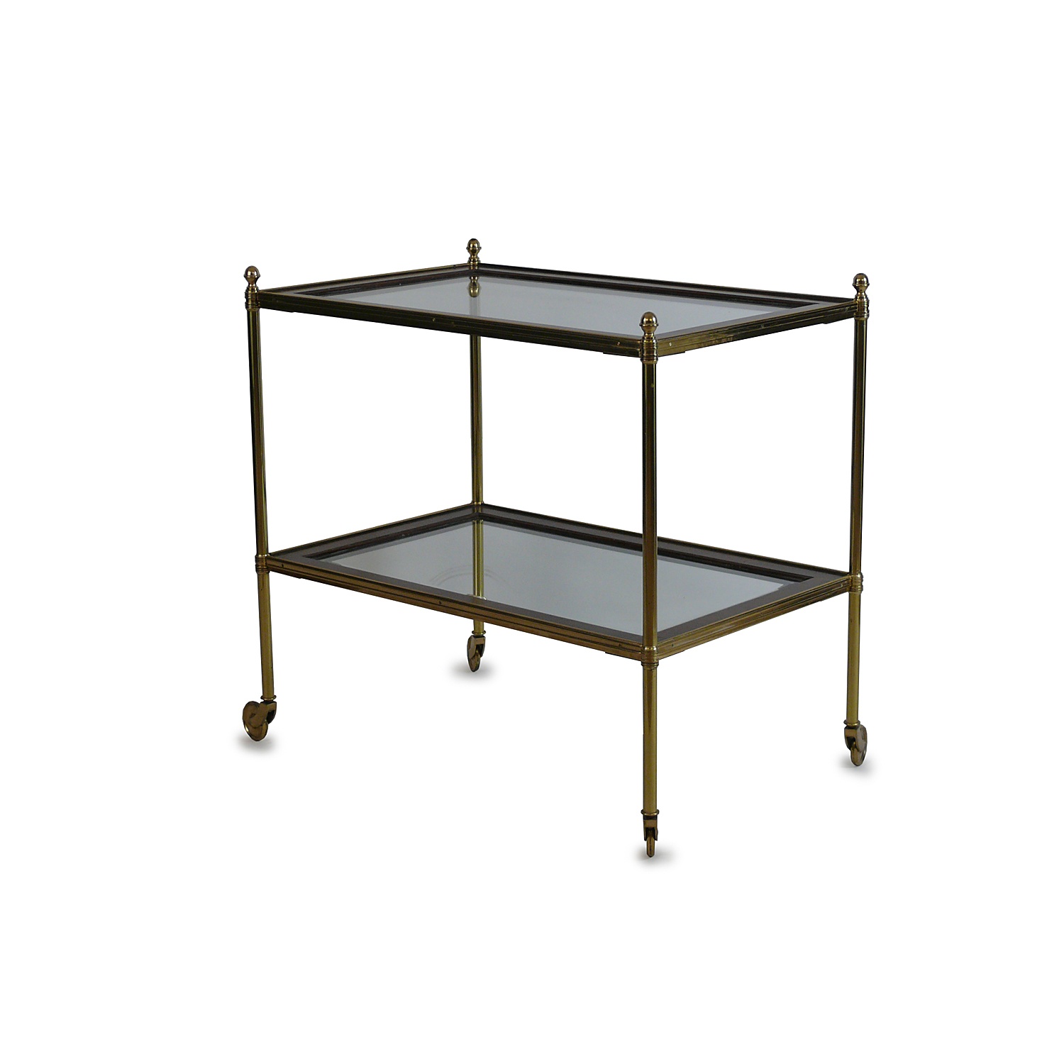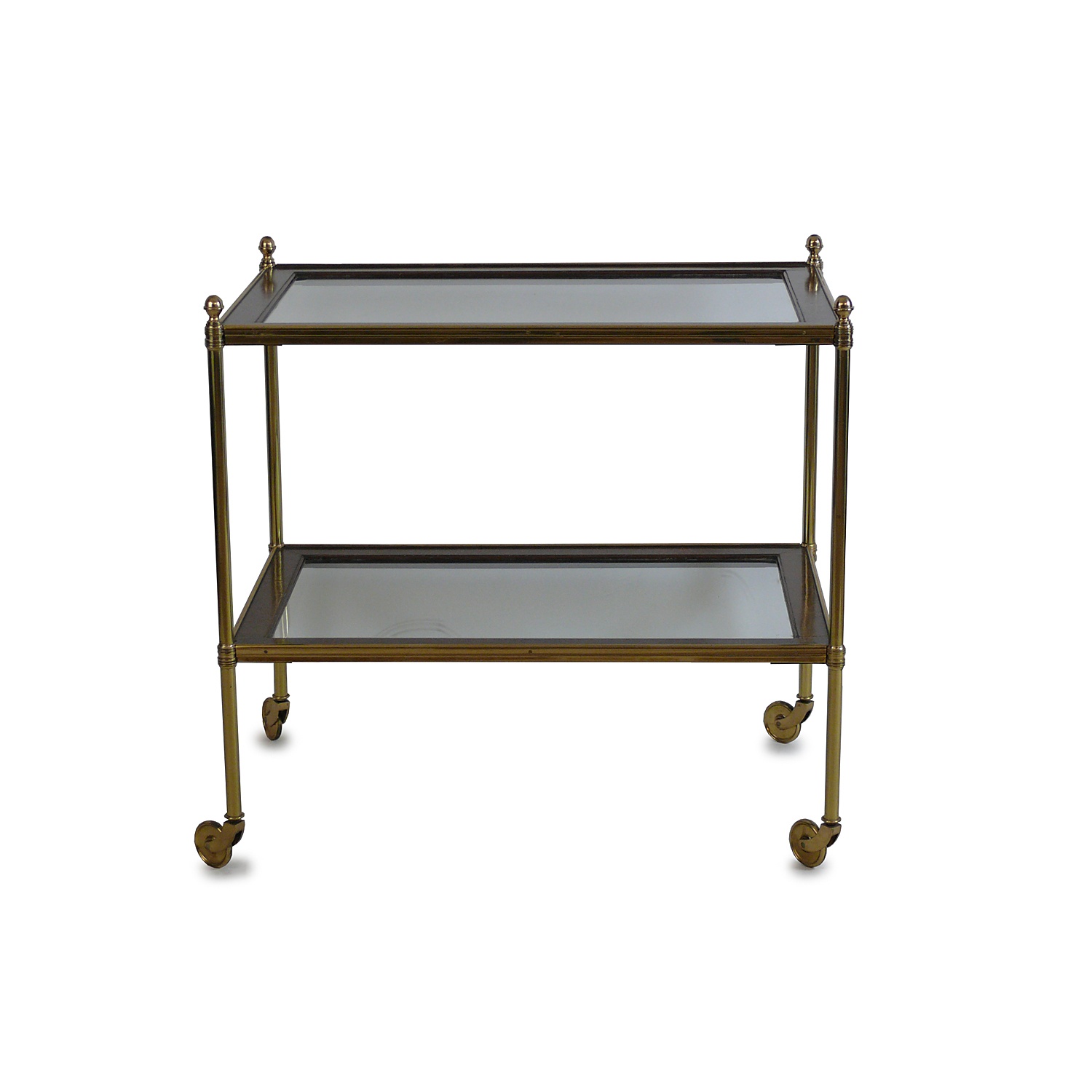 BRASS TWO TIER TROLLEY WALNUT FRAMED BEVELLED GLASS MALLETT 75 CM HIGH 78 CM LONG 51 CM WIDE
