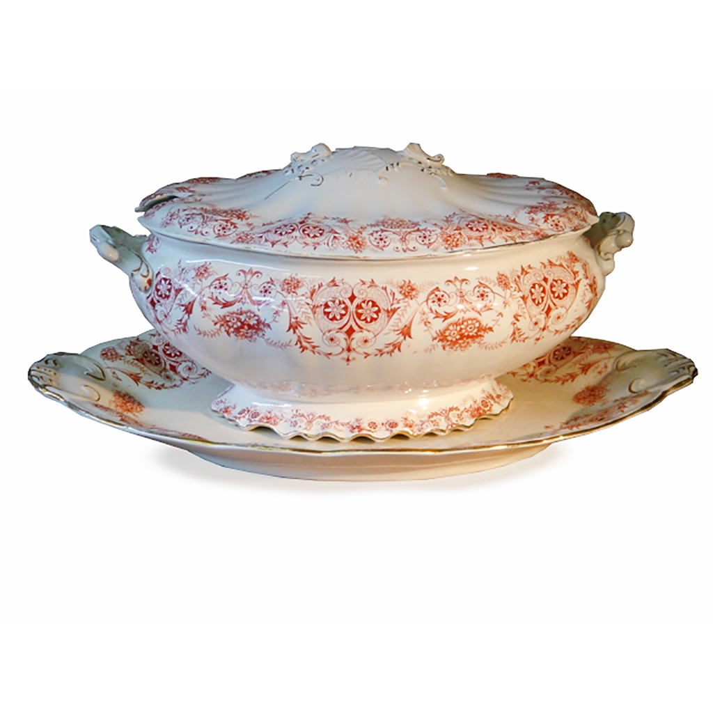 BRIDGEWOOD LARGE BROWN AND WHITE CHINA TUREEN PLUS LID AND OVAL STAND / PLATE 34 CM WIDE