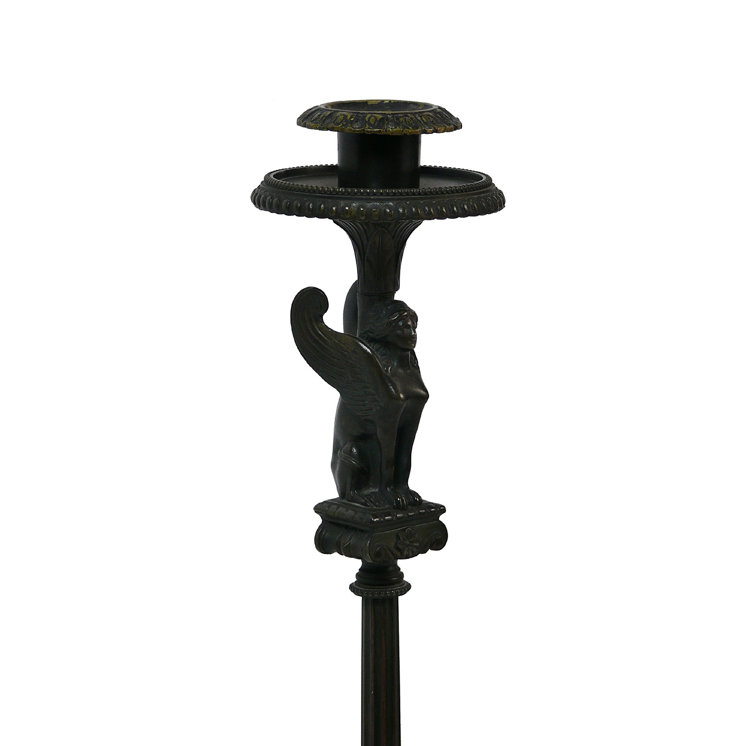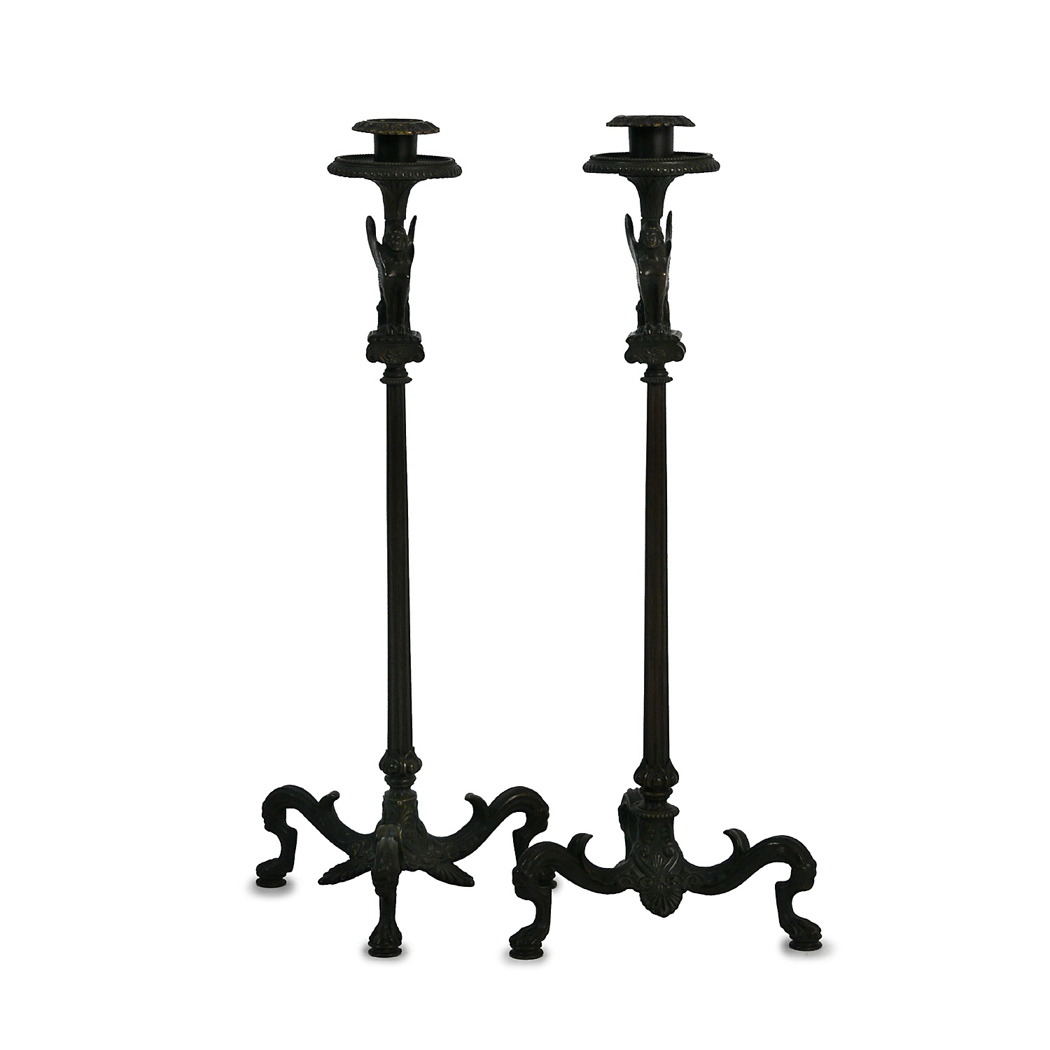 BRONZE CANDLESTICK CLASSICAL ROMAN STYLE FLUTED COLUMN WITH TRI LEG BASE CIRCA 1870 STAMPED VICTOR PAILLARD PARIS 50 CM HIGH 19 CM WIDE (X2)