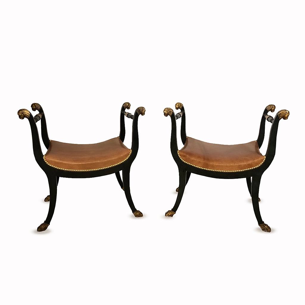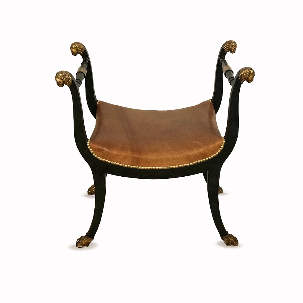 BRONZE GREEN DECORATED SATINWOOD DIRECTOIRE STOOL GILDED LIONS HEAD AND FEET HAVANA LEATHER UPHOLSTERY 69 CM HIGH 63 CM WIDE 44 CM DEEP(X2)