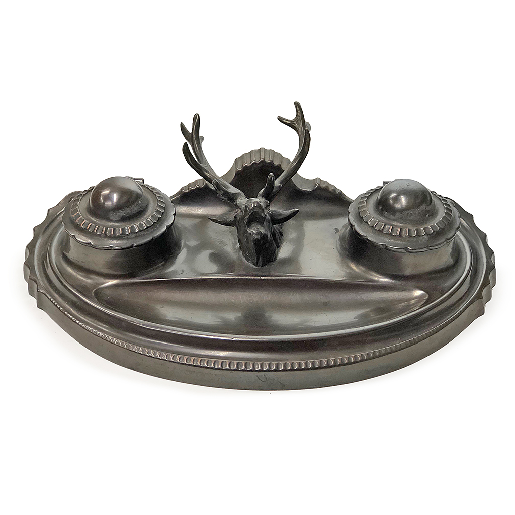 BRONZE INKSTAND WITH STAG HEAD PEN HOLDER AND TWO INKWELLS WITH CHINA LINERS 30 CM WIDE