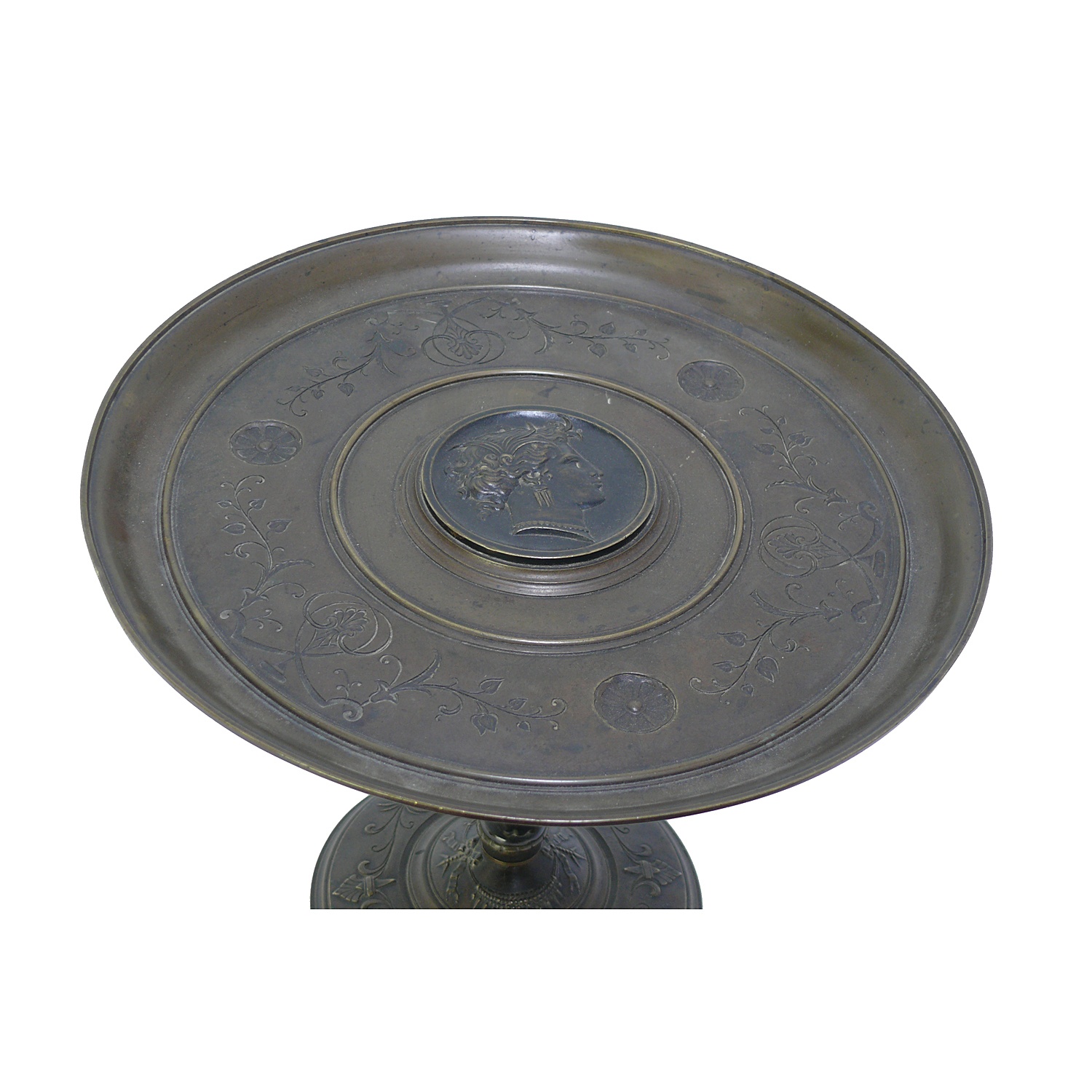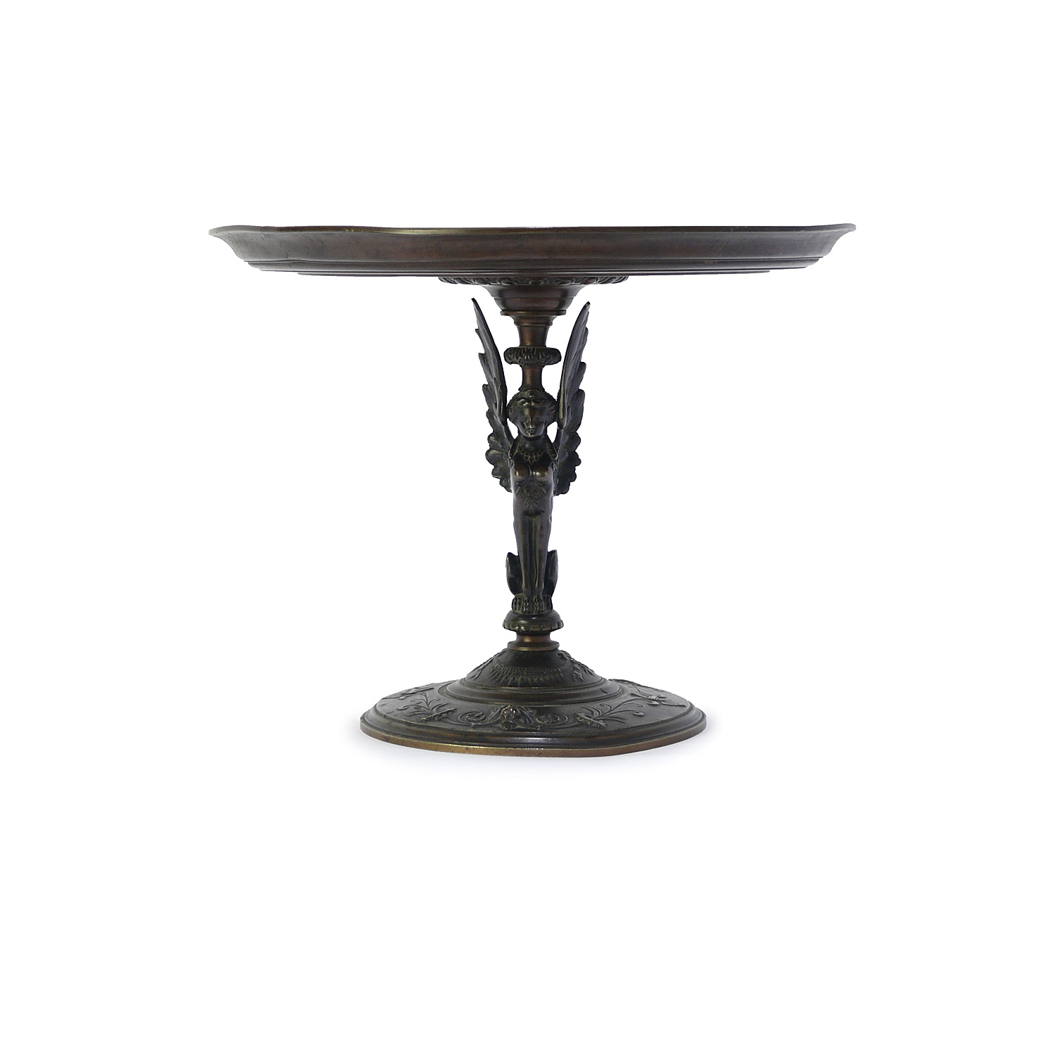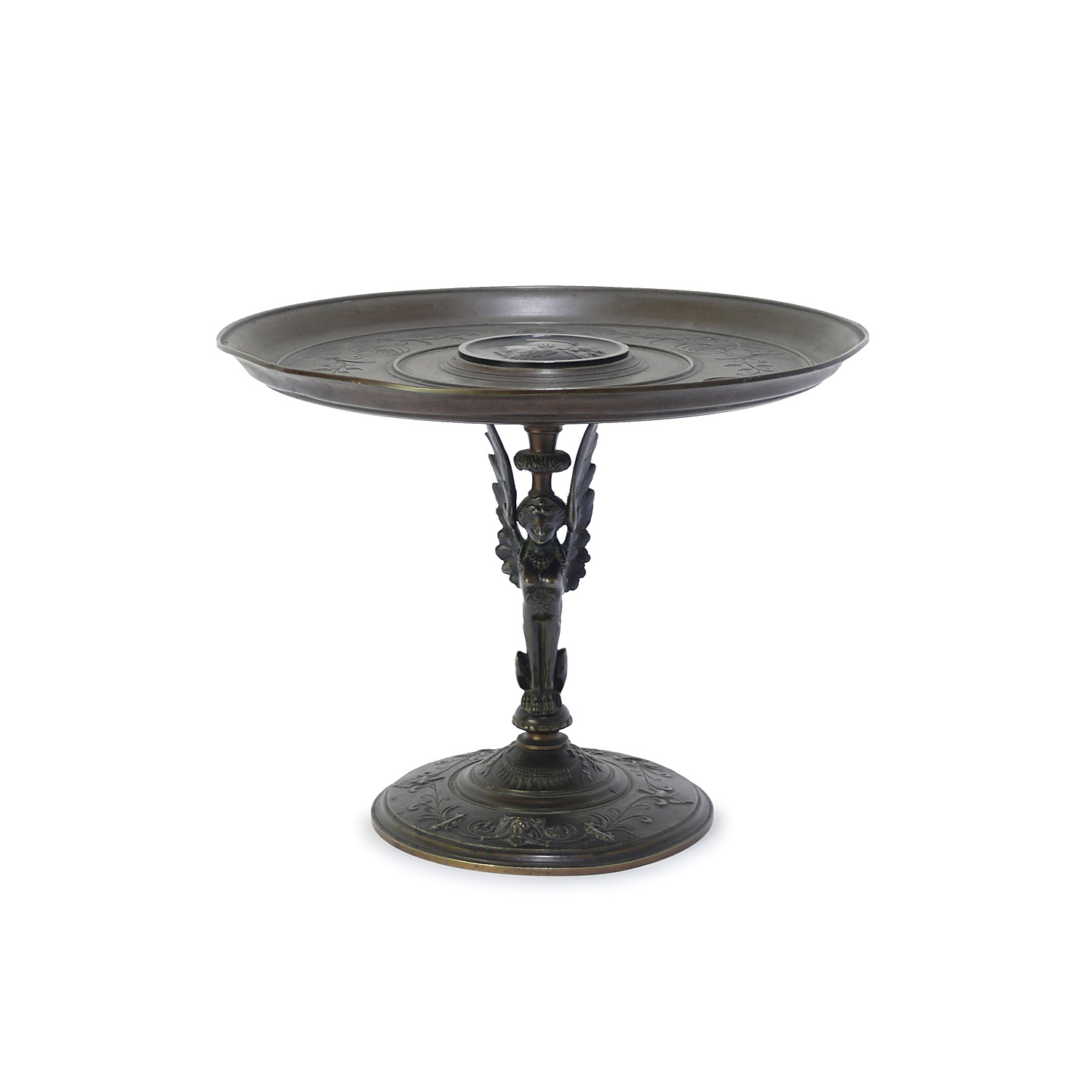 BRONZE TAZZA SHALLOW DISH ON A WINGED VICTORY PEDESTAL BASE CIRCULAR BARBEDIENNE FOUNDRY 24 CM HIGH 30 CM DIAM