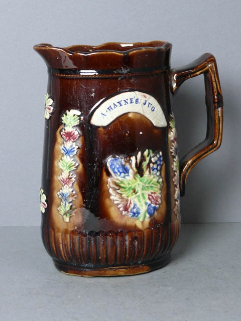 BROWN BARGEWARE JUG INSCRIBED A.HAYNES JUG 21 CM HIGH